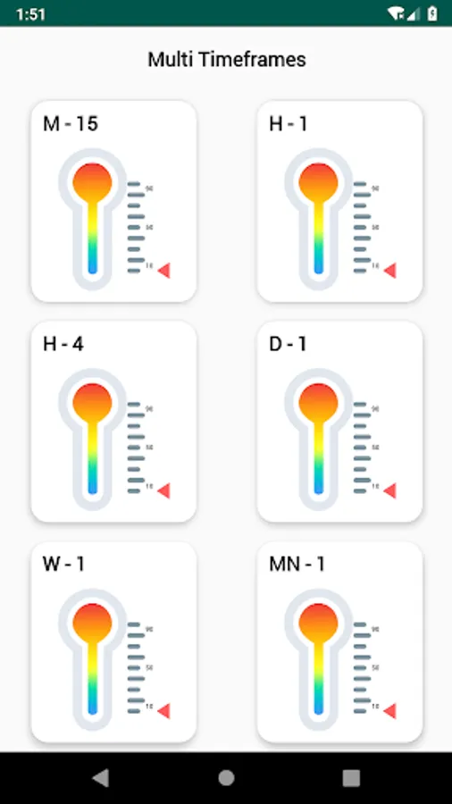 The Indexes strength indicator screen of Indices Heatwave app shows the strength and weakness of the Indices in meter format.