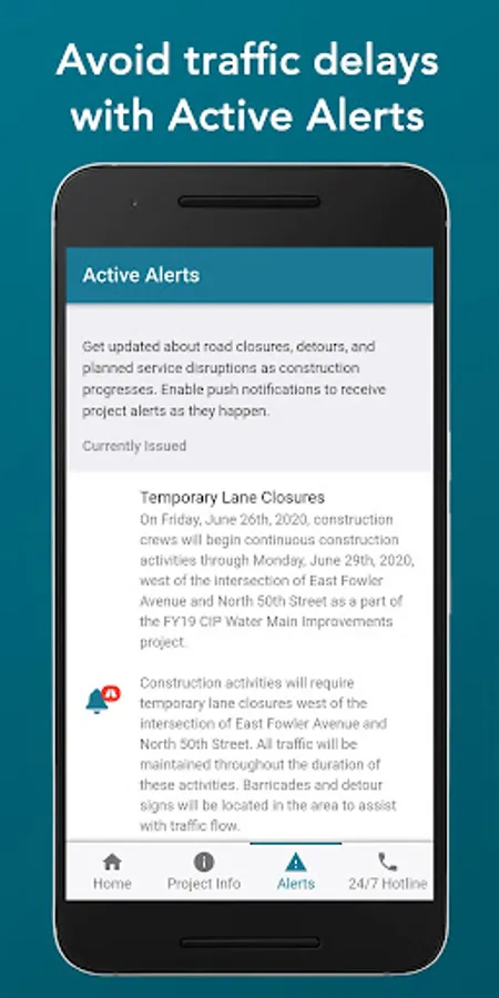 * Stay updated about road closures, detours, and utility disruptions before they happen with push notifications.