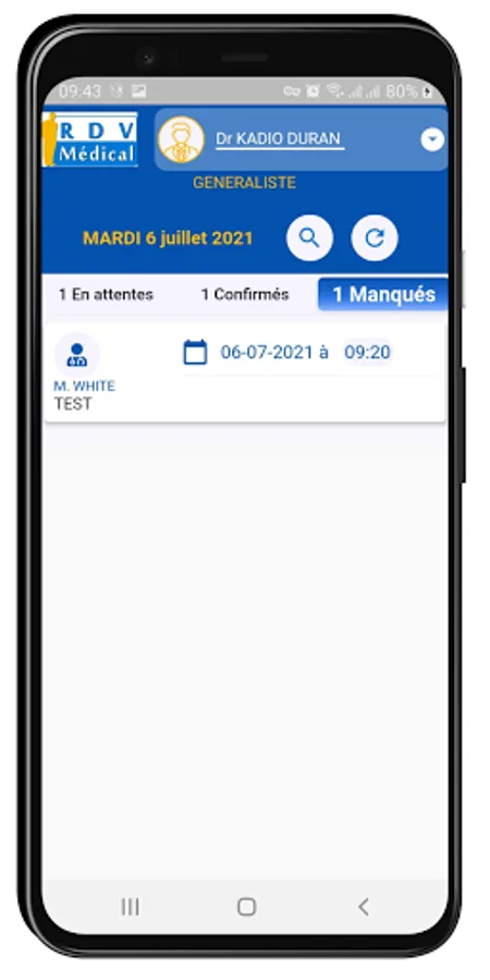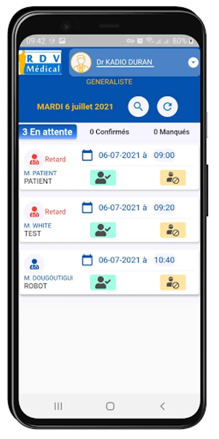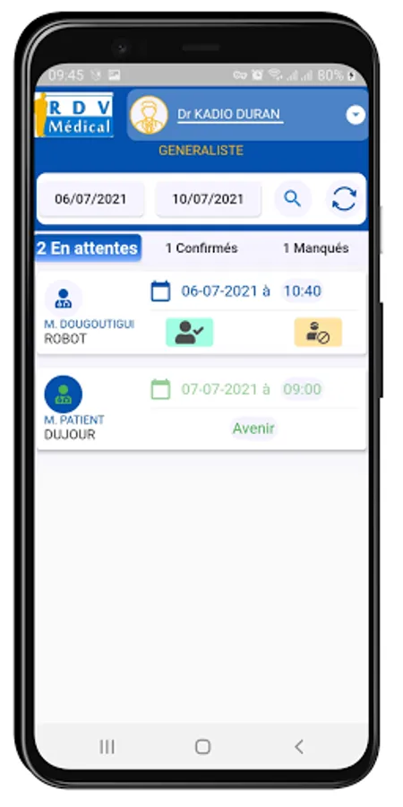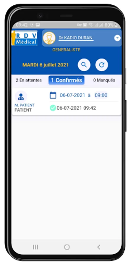 Application for managing appointments for Doctors, it allows a connected user (doctor) to see their current, upcoming and past appointments that had been planned and recorded by the reception of their health establishment. The connected Doctor can indicate that his Patient has come for the appointment (appointment confirmed) or that the Patient has missed his appointment (appointment missed). The Medical Appointment App also allows the Doctor to follow the calculation of his fees on a daily basis.