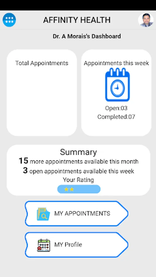 Doctors can view work schedules, appointments, specialities as well as view and edit their profile to be shown in Affinity health care app.