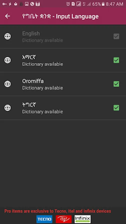 Amharic Keyboard (fyn Geez), Tigrigna Keyboard, Afaan Oromoo keyboard, Ethiopian Keyboard, helps you write in Amharic, Tigrigna and Afaan Oromoo languges.