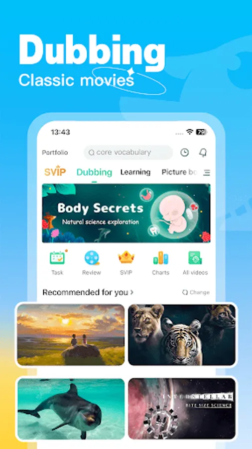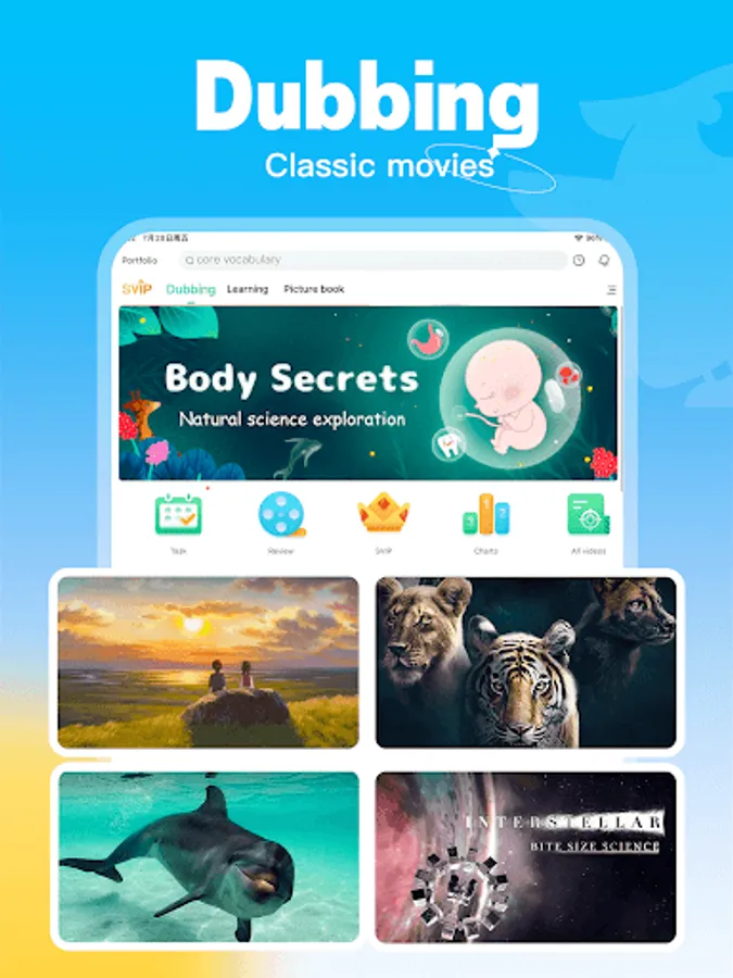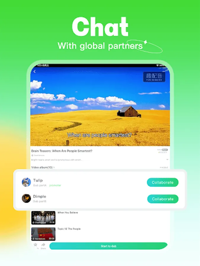 Lingodub improves the English level by dubbing interesting English videos. It is full of fun, easy to understand, and easy to use.