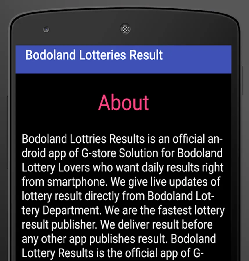 Bodoland Lottries Results helps users to verify daily lottery results directly on their smartphone. We uploads results as soon as it released at government website/gasset. This application does not bother its users with unwanted notifications and it can function any mobile network (2G, 3G, 4G, 5G).