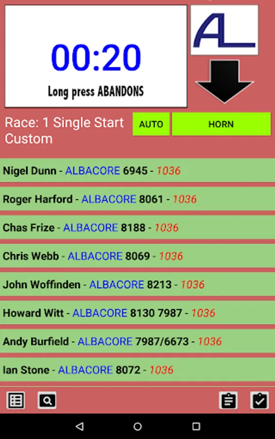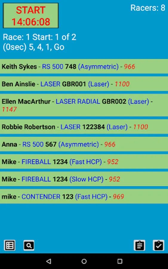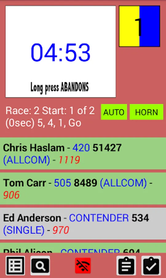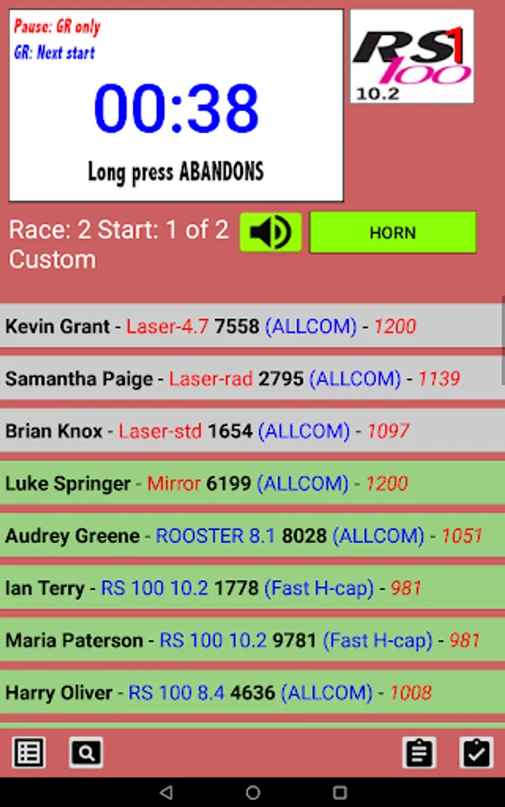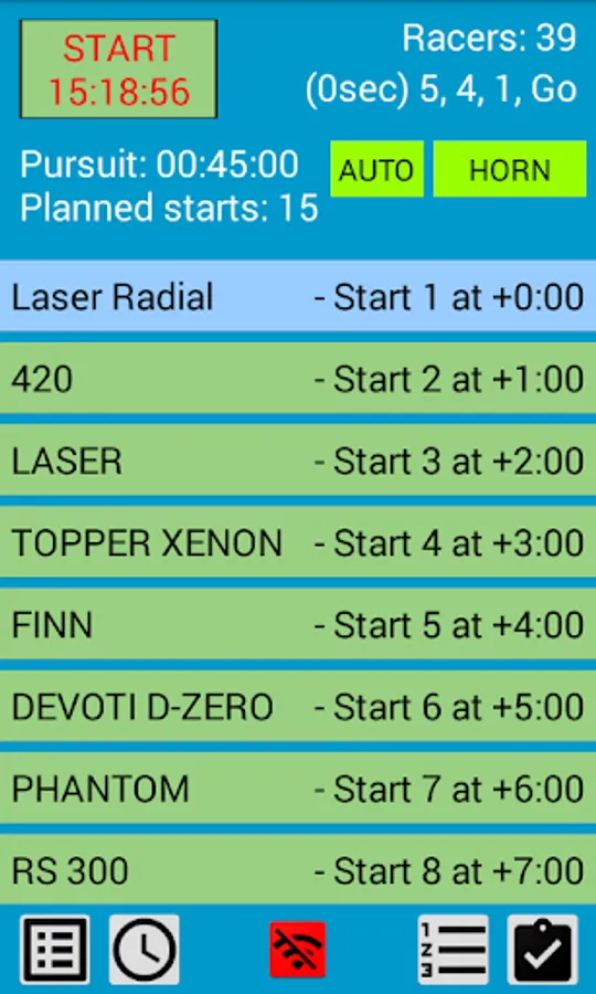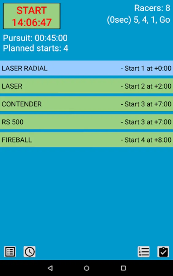 - Manages single fleet main start sequence (5, 4, 1, Go, 3, 2, 1, Go, Custom, or RC Countdown), provides flag reminders (optionally custom), plus optional 'horn' reminders, and voice or beeps at 10s, 5s ,4s, 2s, 1s prior to next horn/flag