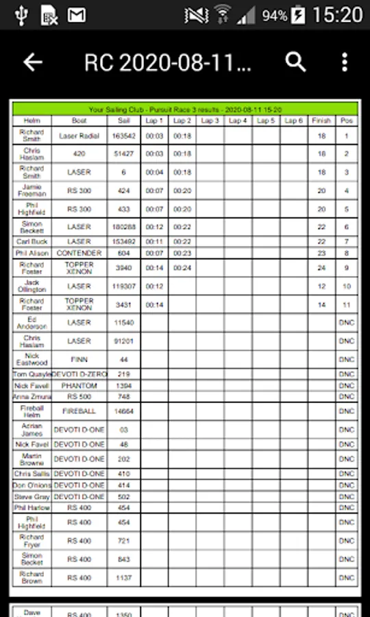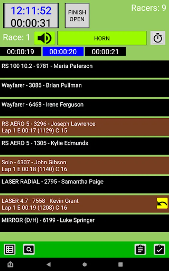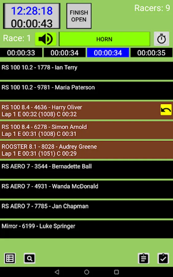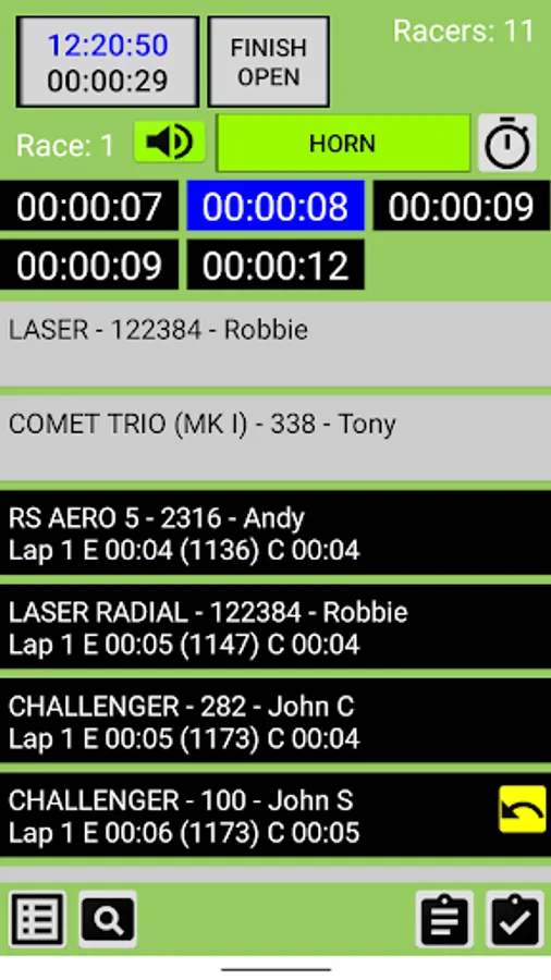 - Captures and displays individual boat last lap times (up to 10), plus number of laps completed (adjusted to fleet start for multi-fleet). Plus To be Assigned (TBA) to allow capture and assign later...