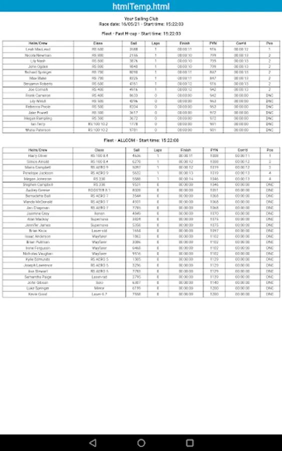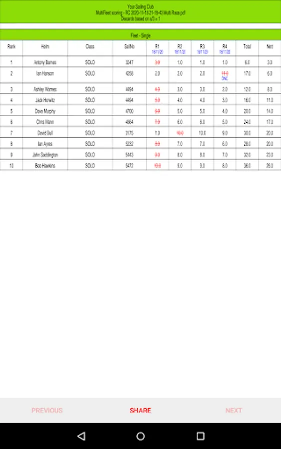 - Multi-fleet results are displayed by fleet, and the final position with each fleet (Coded competitors are listed last)