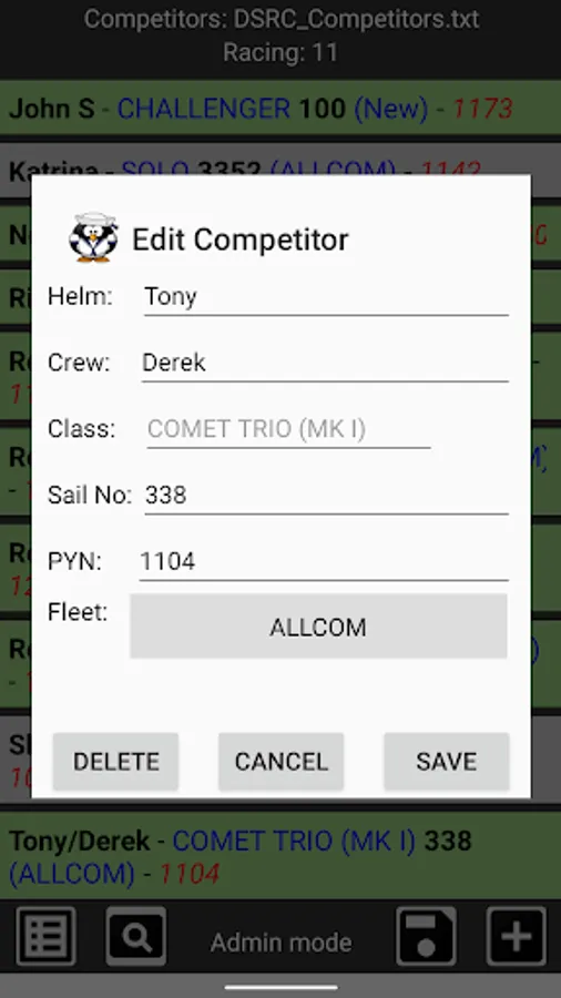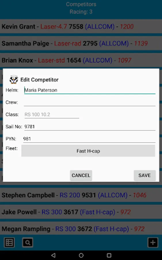 - Includes search by Sail No and Helm name, and now in race mode, allows lap capture and new competitor additions (restart sailing)