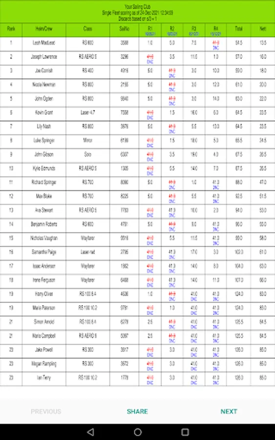 - Can build a list for single fleet or multi-fleet, multi-start racing. Either: