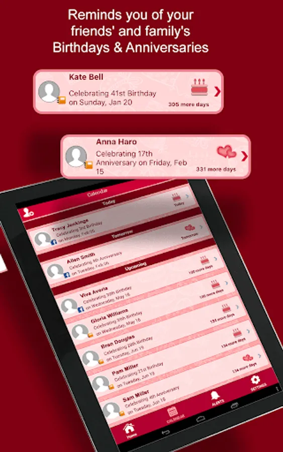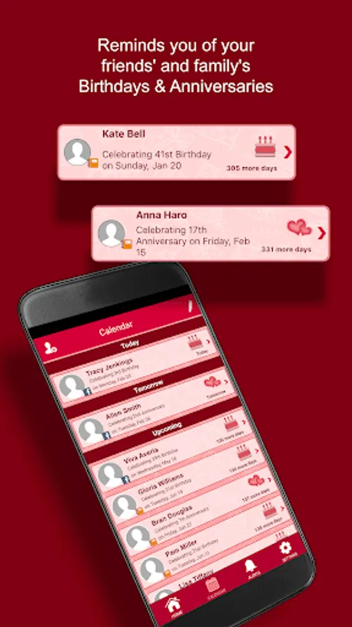 • Sync up your phone book and social media contacts with the App, for easy access to their birthdays & anniversary dates.