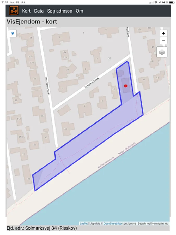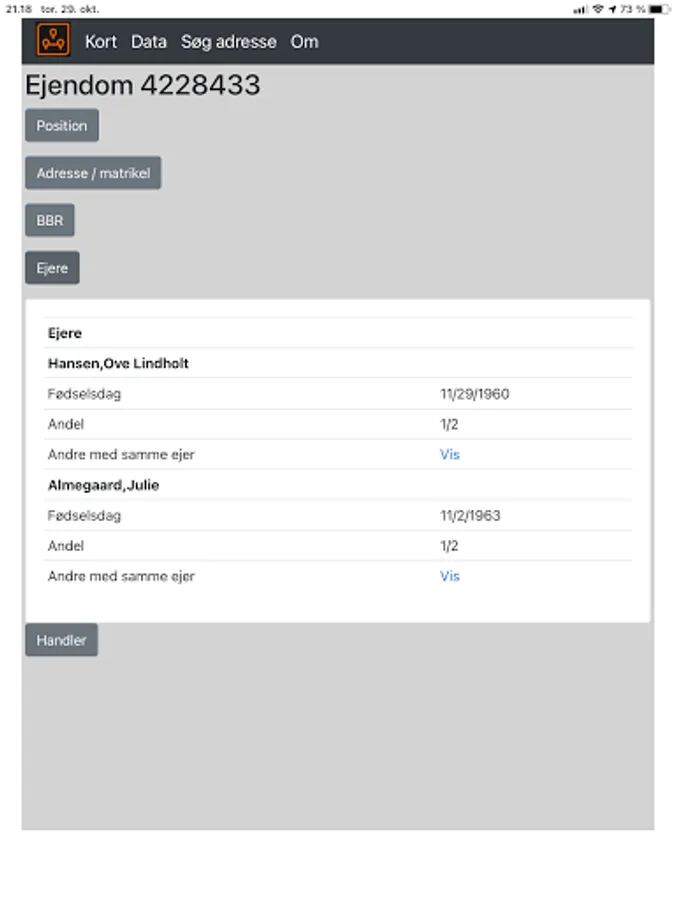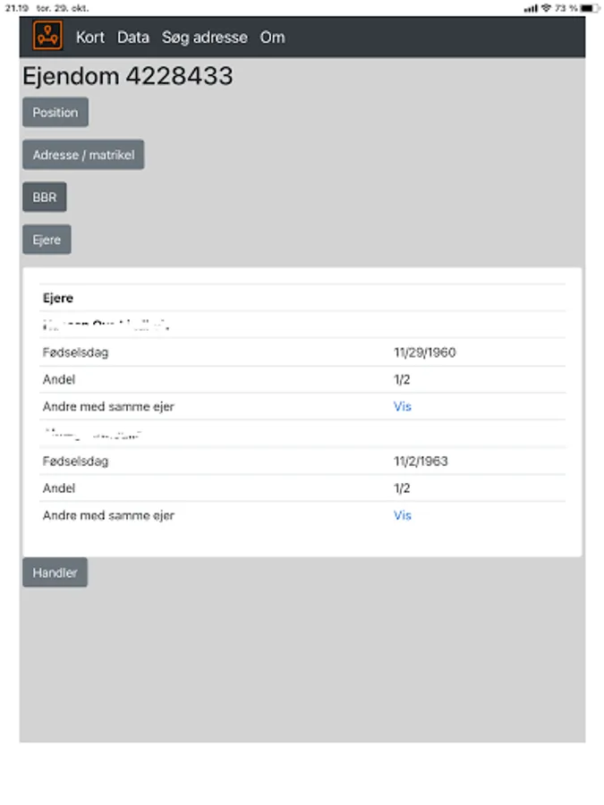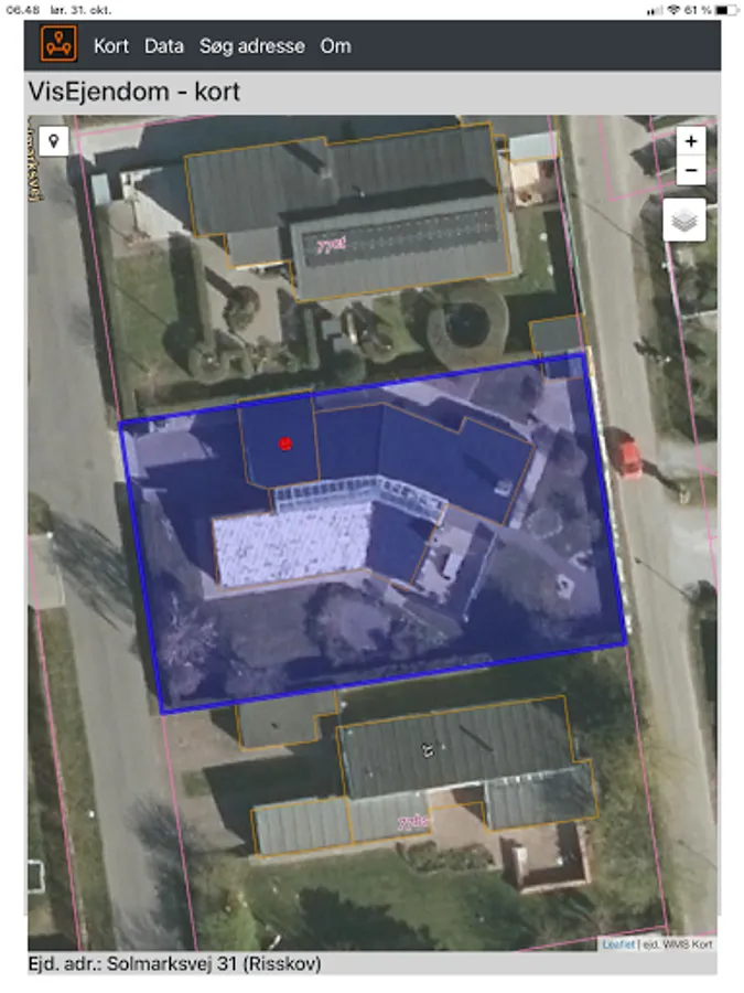 OIS data in an app. You can see the size of a property on a map. All cadastres are displayed. And the property's associated information is displayed, including owner's name and trade prices. Data is retrieved from free data on the data distributor, and corresponds to OIS.dk.