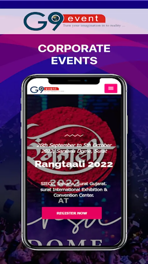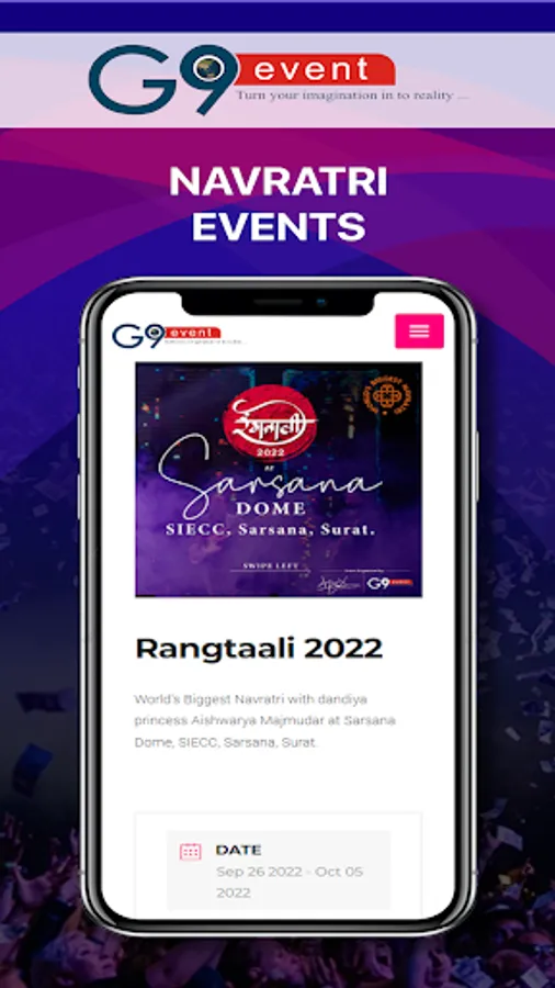 G9 EVENT had done individually / JV,23 successful Navratris & more than 30 Mega Star shows involving Bollywood Celebrities i.e. SONU NIGAM, ATIF ASLAM, HIMESH RESHMIYA, SHREYA GHOSAL, AKSHAYKUMAR, DALER MEHNDI, MIKA SINGH, JAGJIT SING, BADSHAH LIVE IN CONCERT, NEHA DHUPIA, AADESH SHRIVASTAV, MUGDHA GODSE, PREETI JANGHITANI, PRATIMA KAZME, RATI AAGNIHOTRI, DEEPAK ANANDJI, PIYUSH RAJANI, BAMBOO BITS, IMRAN HASMI in SURAT.