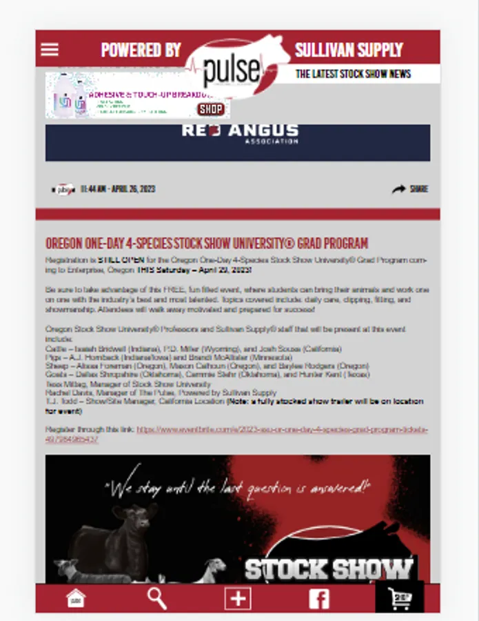 Your instant source for stock show news and information on everything in the show cattle industry! From instant show results and pictures , to promoting your next herd sire and sale, to daily industry news, we have it all! Don't miss a beat of the show cattle industry with The Pulse!