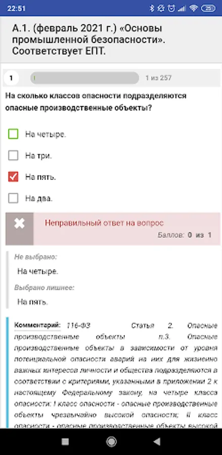 - If the answer is not correct, the correct option is shown, as well as a comment with links to regulatory documents;