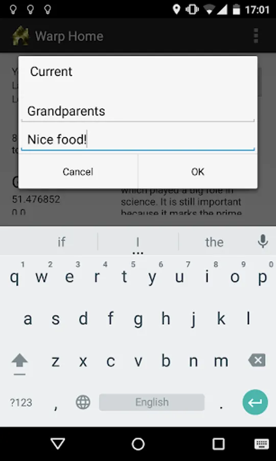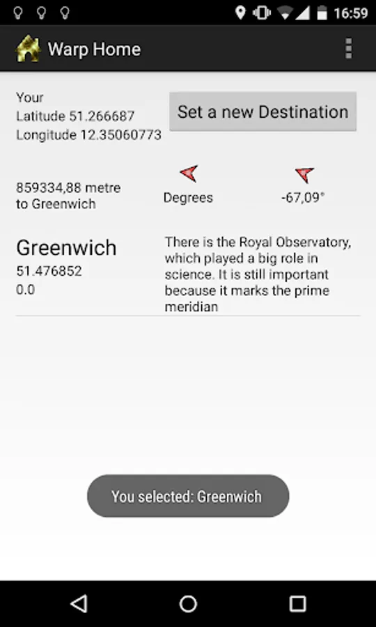 You may enter, label and save locations knowing their latitude and longitude. Start with entering your current location, which is displayed in the app, in the current location field. Maybe it is your home? Warp Home will guide you back to all the locations you saved previously.