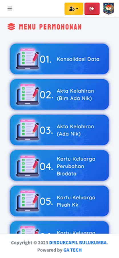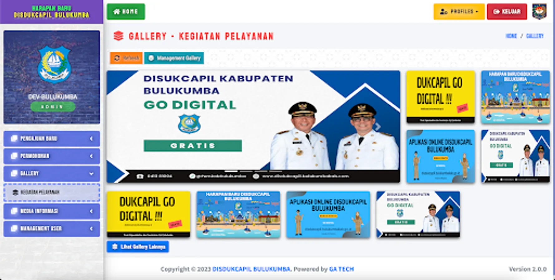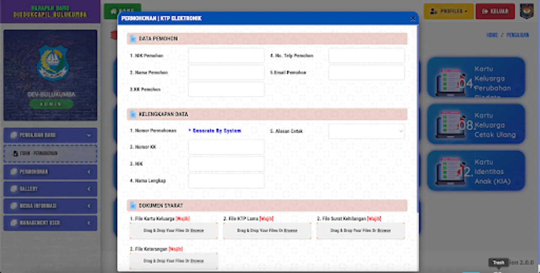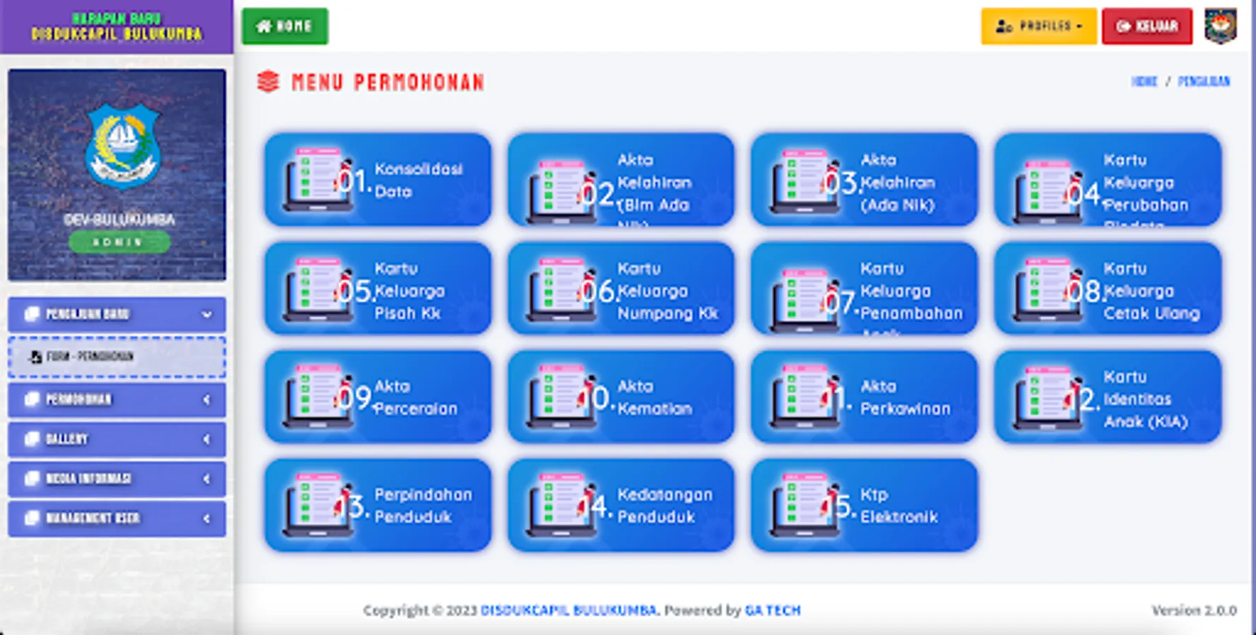 The Disdukcapil service application for Bulukumba Regency, South Sulawesi is a transition from Offline services (at the office) from the Bulukumba Regency Population and Civil Registration Service.