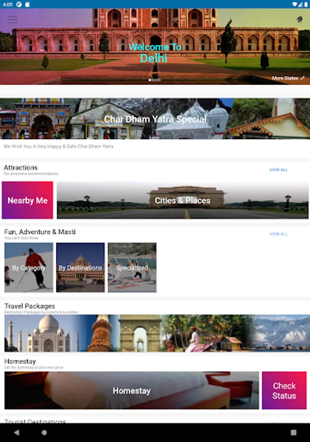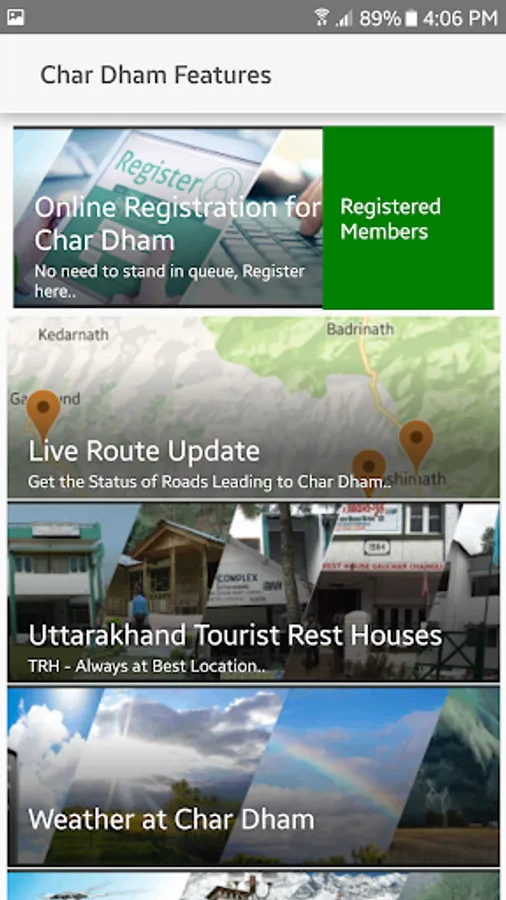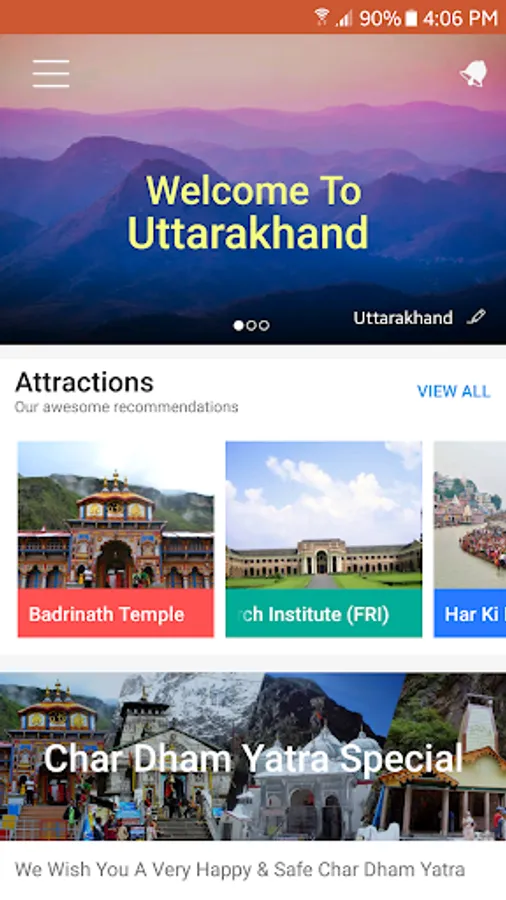 ExploreOuting is Uttarakhand Tourism and Char Dham Yatra Mobile app in which you get Online Yatra Registration within App and Save Yourself from Queue, Get Regular Updates about Char Dham Yatra, Road and Weather Conditions, Get Your Queries Answered, Char Dham Tour Packages, Hotels and Tourist Rest Houses from GMVN. In association with Ministry of Tourism, Uttarakhand and Garhwal Mandal Vikas Nigam (GMVN) user can Explore Uttarakhand Tourism like never before get places to enjoy Scenic Hills, the Holy Ganga, Fun & Sports activities, Skiing in Auli, trekking places in Uttarakhand, Forest and Wild life places and many more. All the famous Char Dham Badrinath, Kedarnath, Gangaotri, Yamunotri comes under Gahrwal region of Uttarakhand. This Mobile App helps you in your travel to Garhwal region.