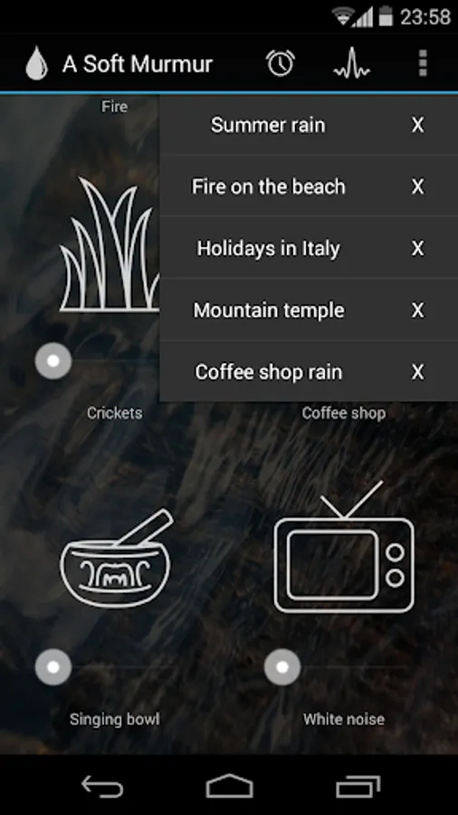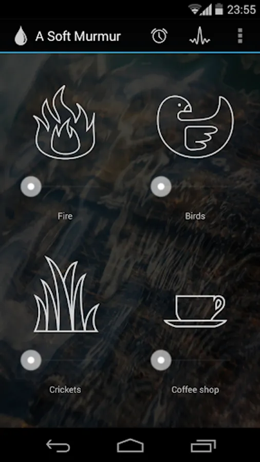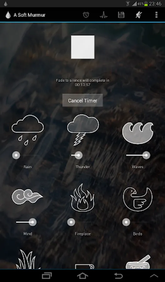 Set A Soft Murmur to fade gently to silence to help you drift into sleep, or set a timer to start or stop playing after a custom length of time. Timers run in the background, even if you user other apps, and show the time left in the notification area. Use timers to transform A Soft Murmur into a versatile productivity app.
