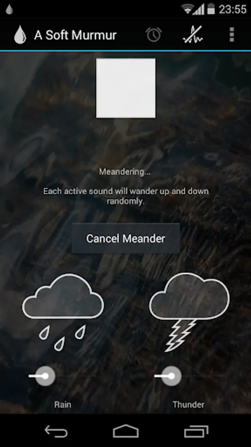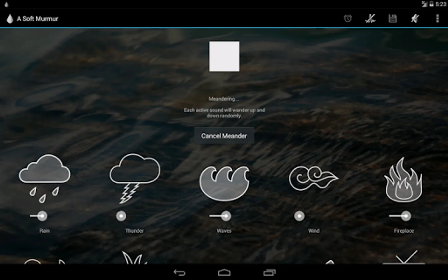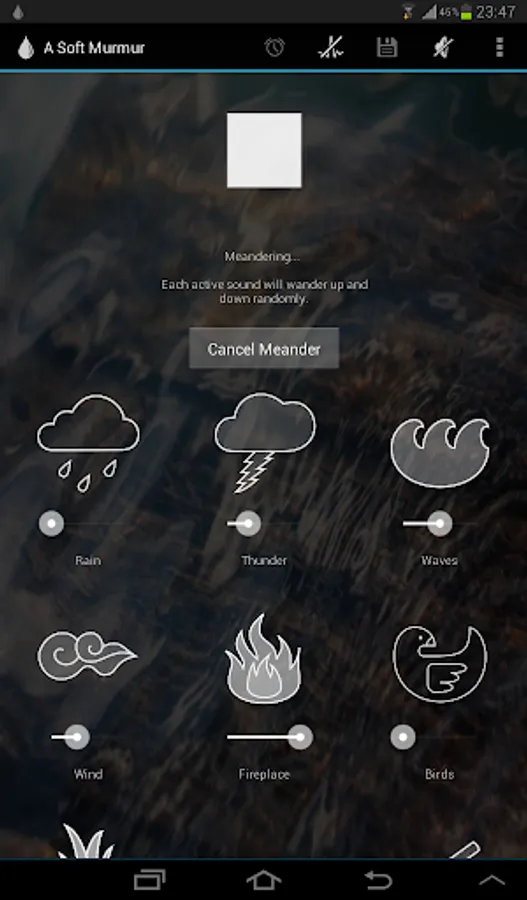When you activate the Meander function, the app gently increases or decreases the volume of each active sound, creating gentle rolling waves of sound that are never the same twice.