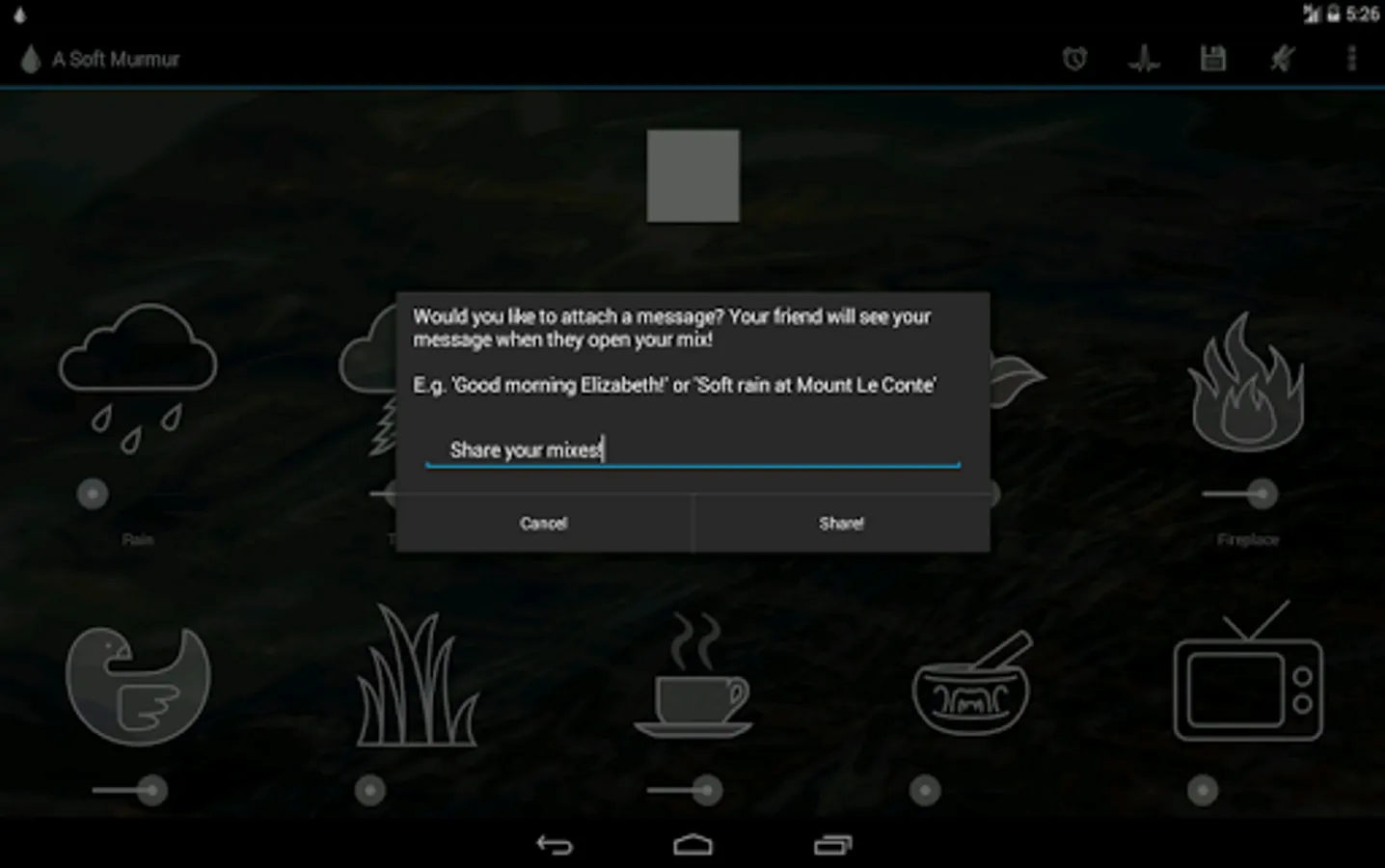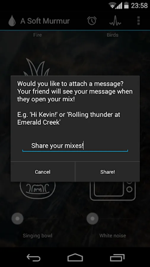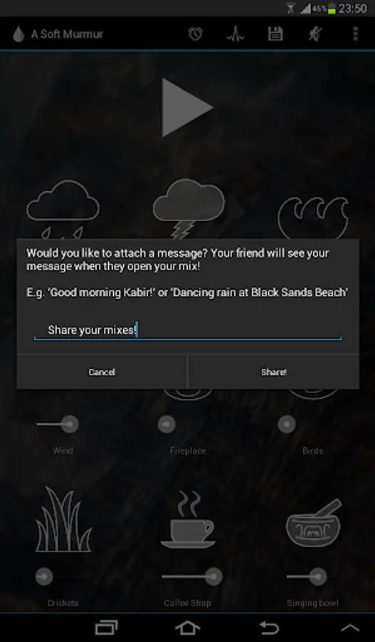 A Soft Murmur lets you share your mixes with friends using Facebook Messenger, Twitter, SMS and hundreds of other apps. If your friend has A Soft Murmur installed they can open your mix in the app. If they don't, they can listen to your mix online.