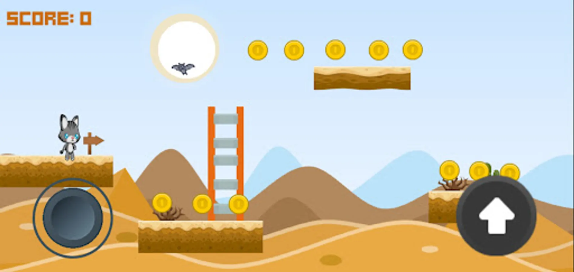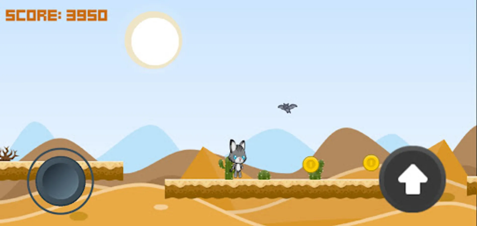 Welcome to this game. The game is a cat who finds himself alone in the desert. The object of the game is to collect the most coins.