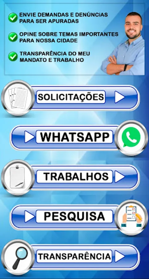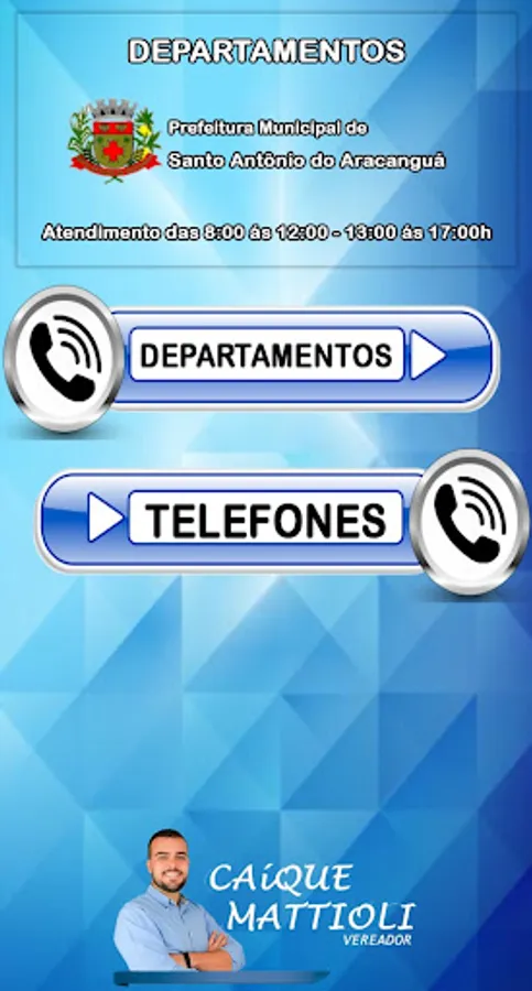 Online Cabinet Councilor Caique Mattioli participate in my mandate, formalized application for citizens, containing suggestions for criticism, praise, denunciations, transparency portal, whatsapp, municipal news and department survey of the municipal network of Santo Antônio do Aracanguá.