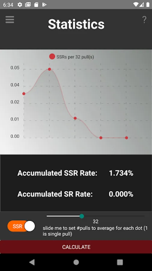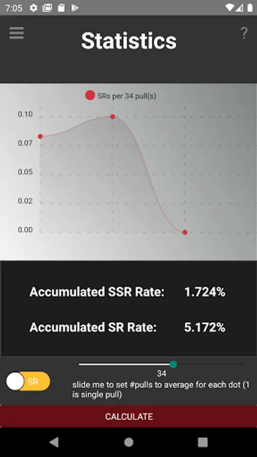After each pull session, enter the currency used and SSRs (6 star) SRs (5 stars) pulled. Over time you will see the actual SSR and SR rate you have accumulated without bias in both numeral and graphical form.