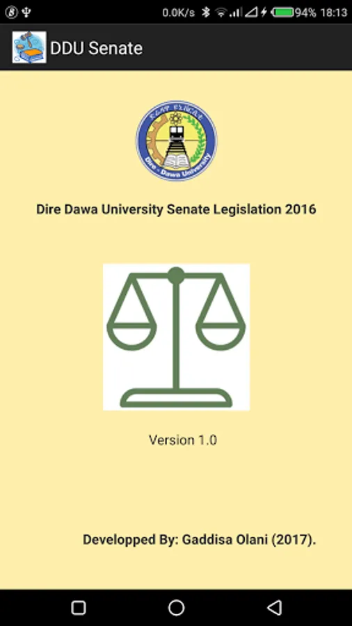 Dear User, this app is a volunteer work by Mr. Gaddisa Olani to help students and other employees of DDU to be familiar with the University legislation. With every new app version we are introducing new features and improving existing ones. We are sure that your feedback will only help us improve further.