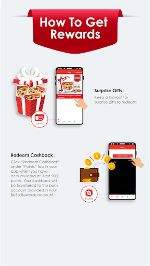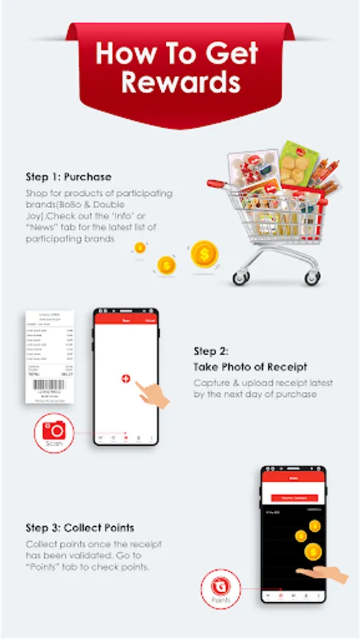 Simply take a photo of your receipt and upload through BoBo Rewards app to earn points. Points will be credited not just for BoBo purchases, but also with every purchase of participating brands in your receipts! Accumulated points can be used to redeem cashback!