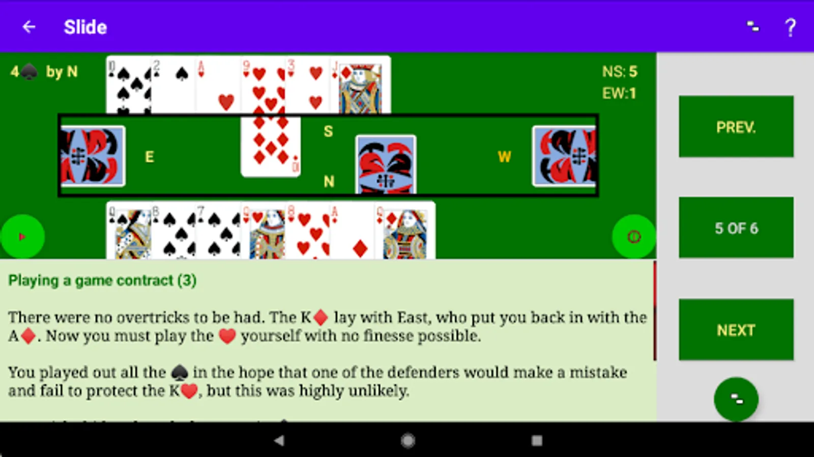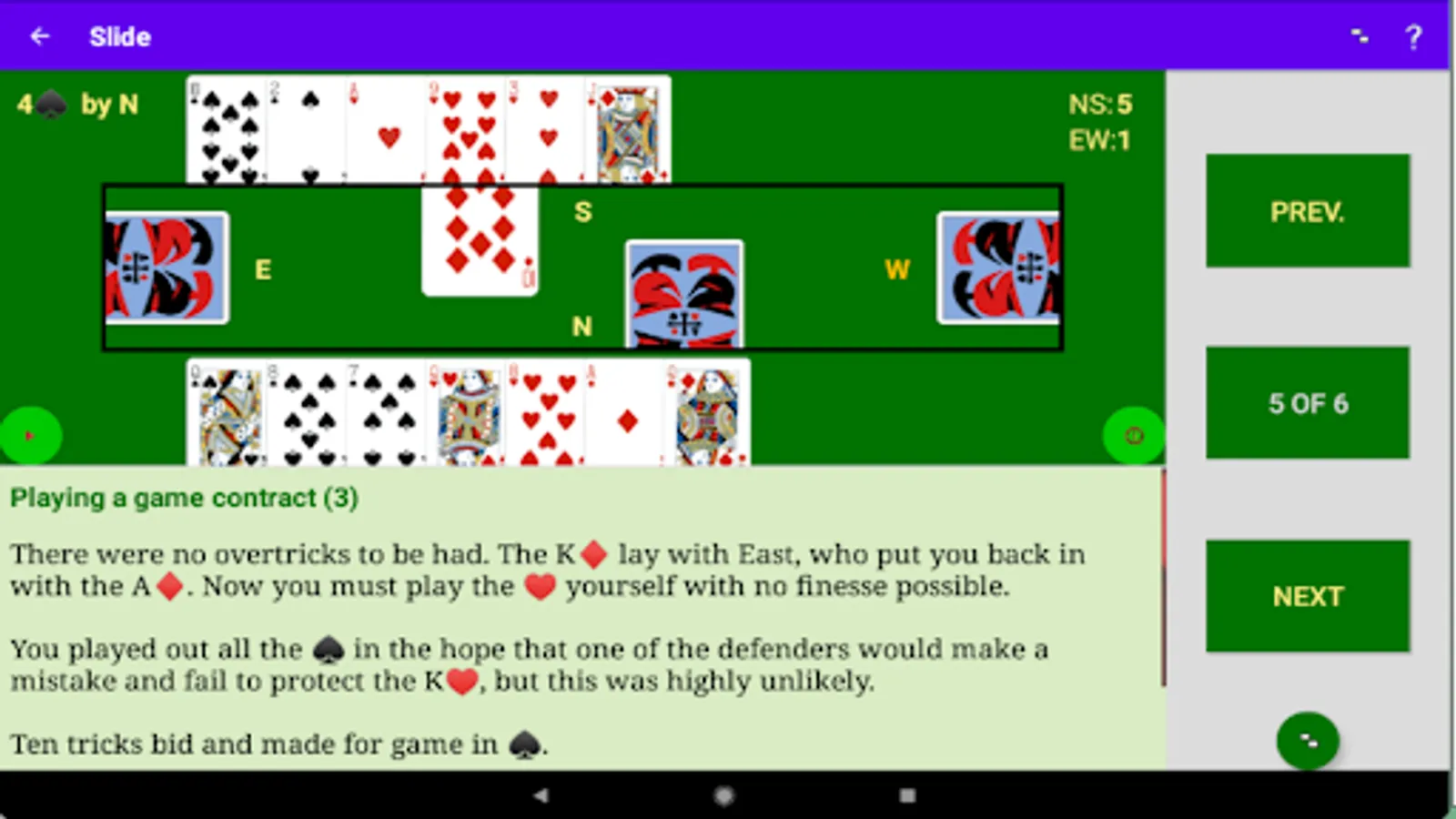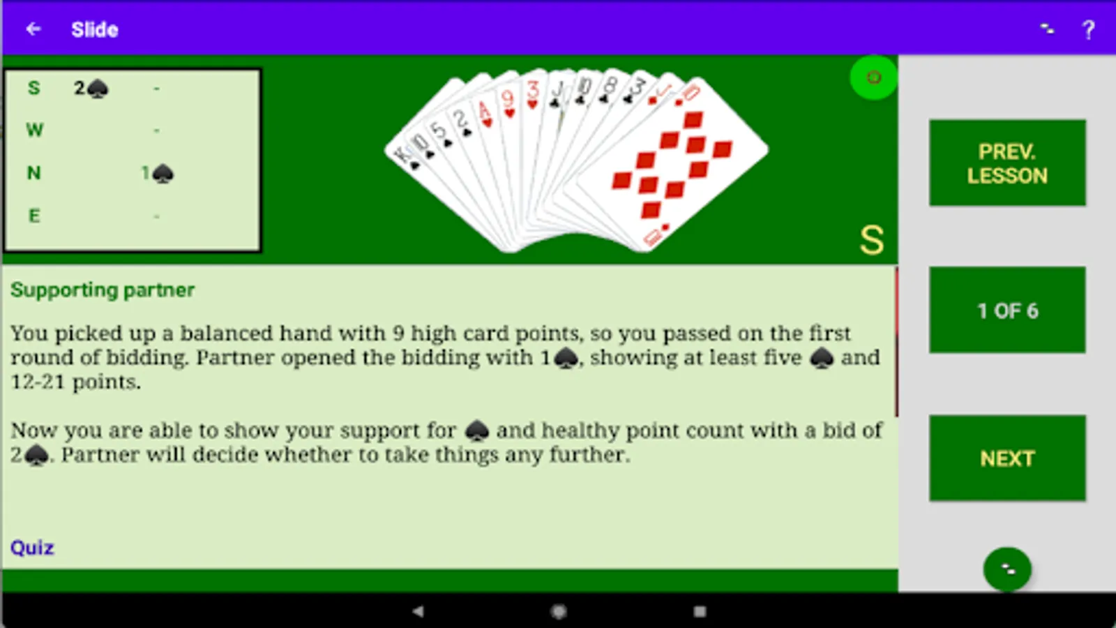 Lessons generally start with the user picking up a hand, then take them through the bidding and the play in a series of 'slides'. Slides can have a quiz at the end. Revisit the lessons as many times as you like. At the end of the lesson, switch to play mode and replay the deal in detail.