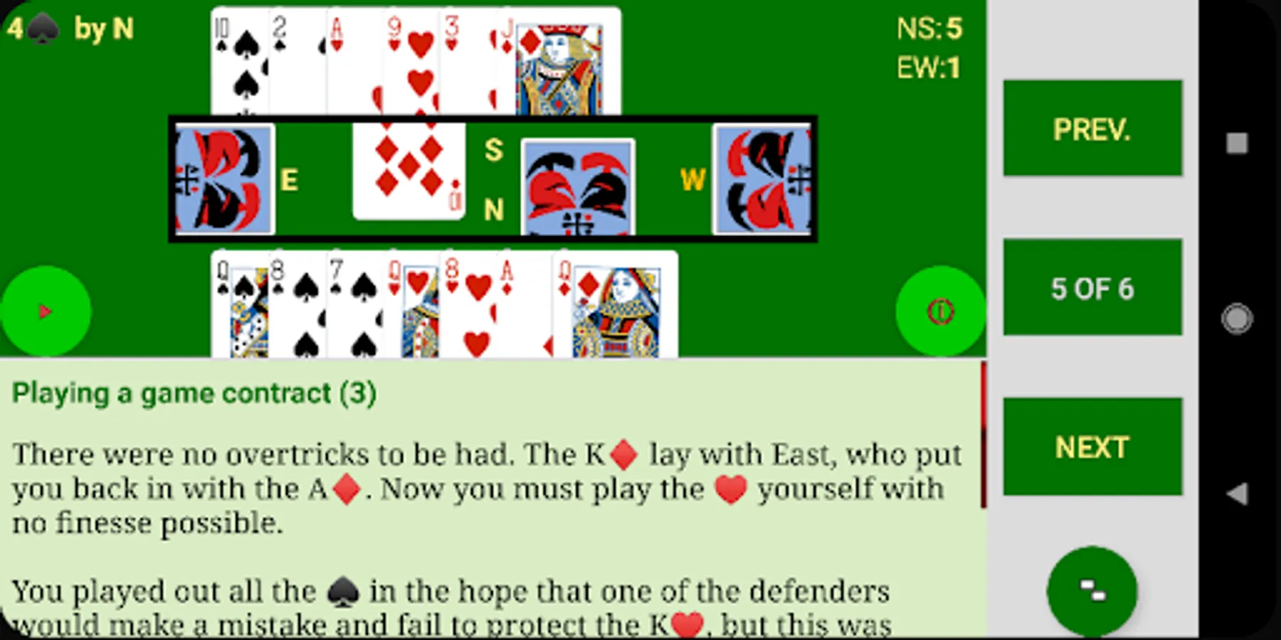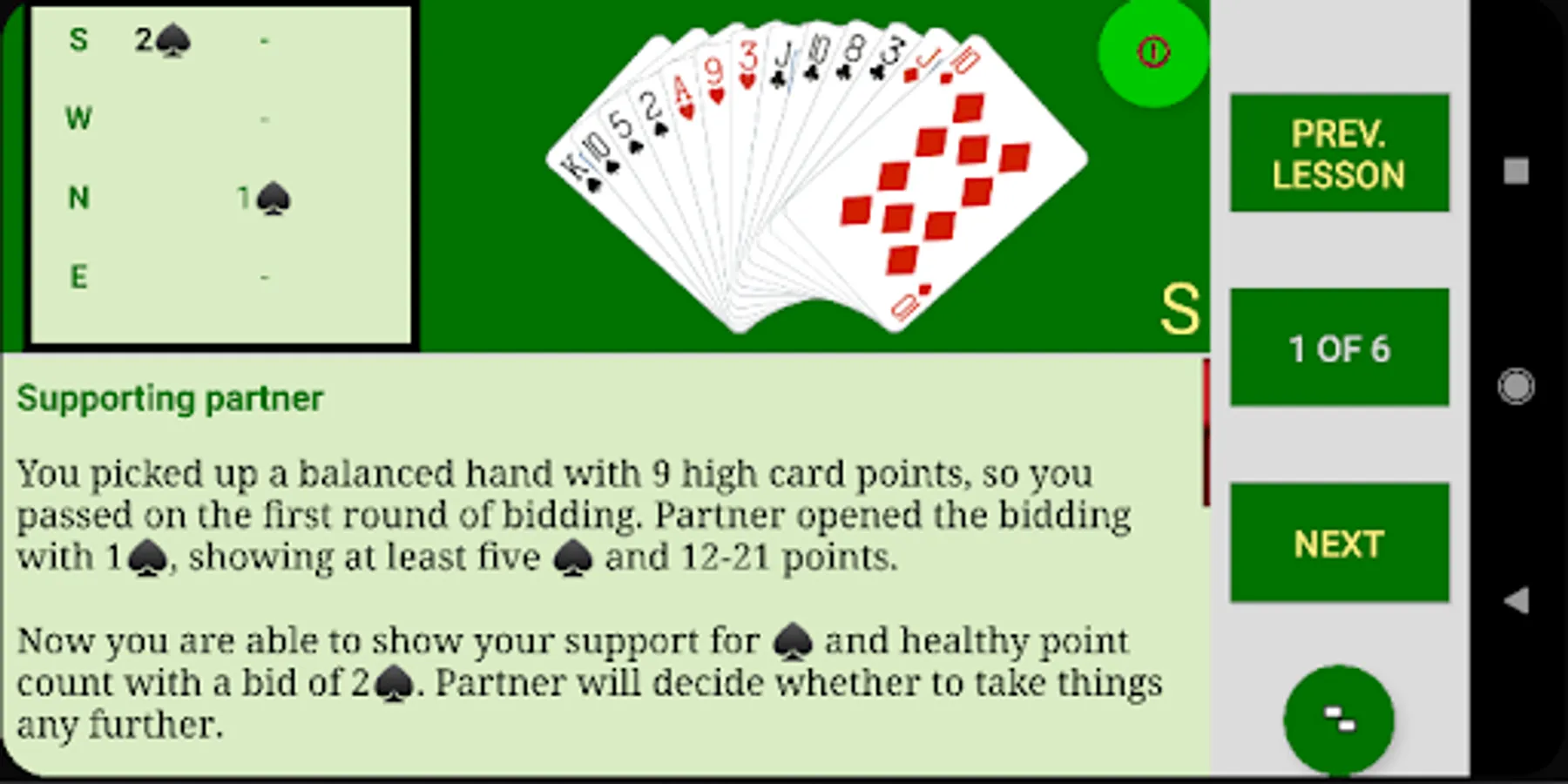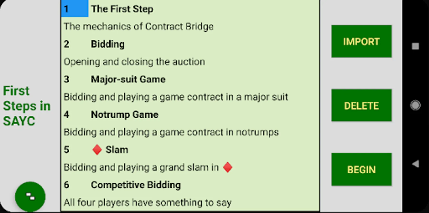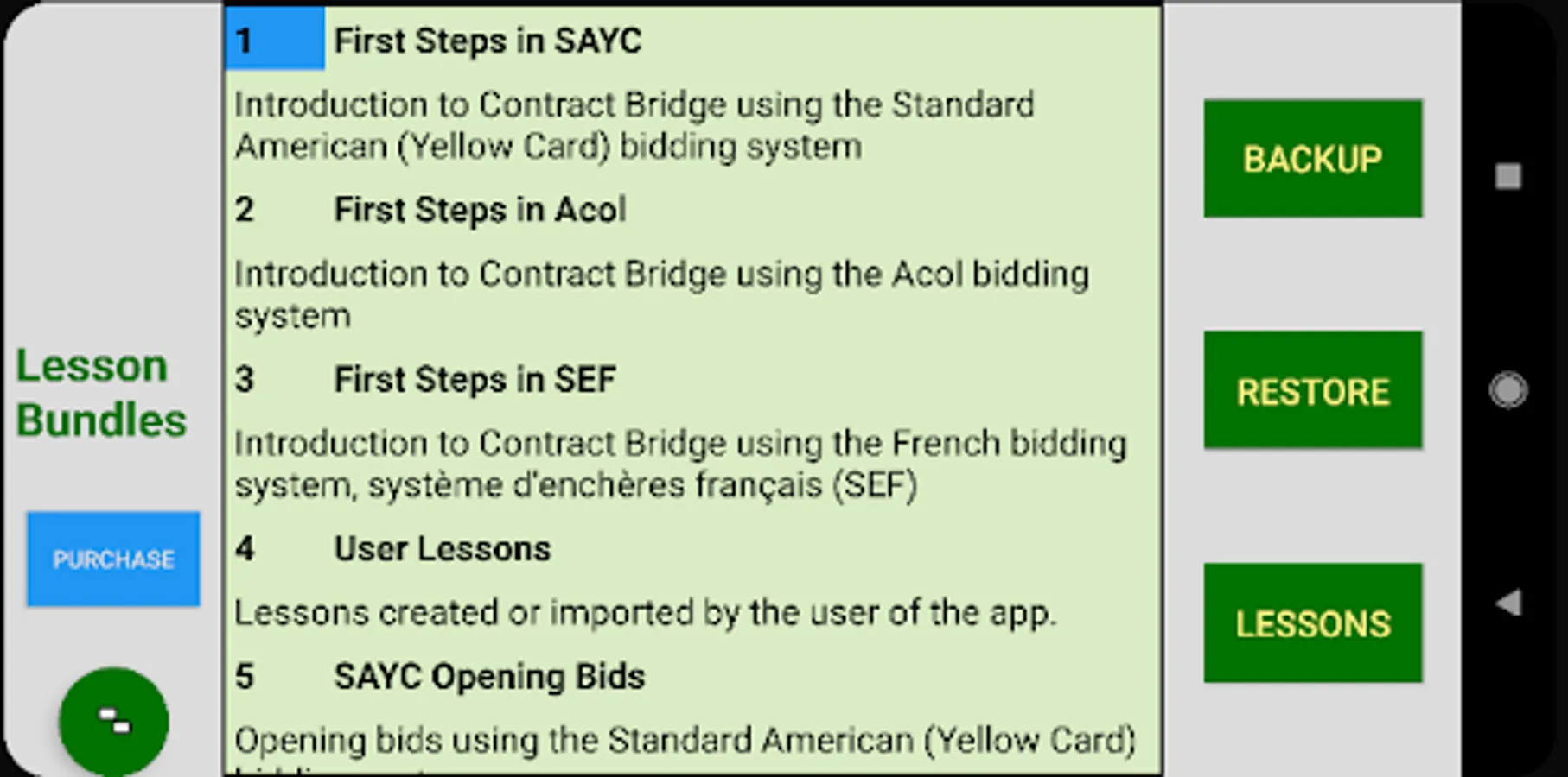 Lessons generally start with the user picking up a hand, then take them through the bidding and the play in a series of 'slides'. Slides can have a quiz at the end. Revisit the lessons as many times as you like. At the end of the lesson, switch to play mode and replay the deal in detail.