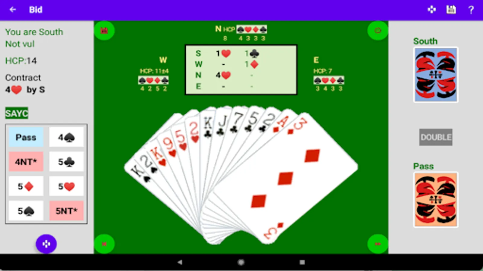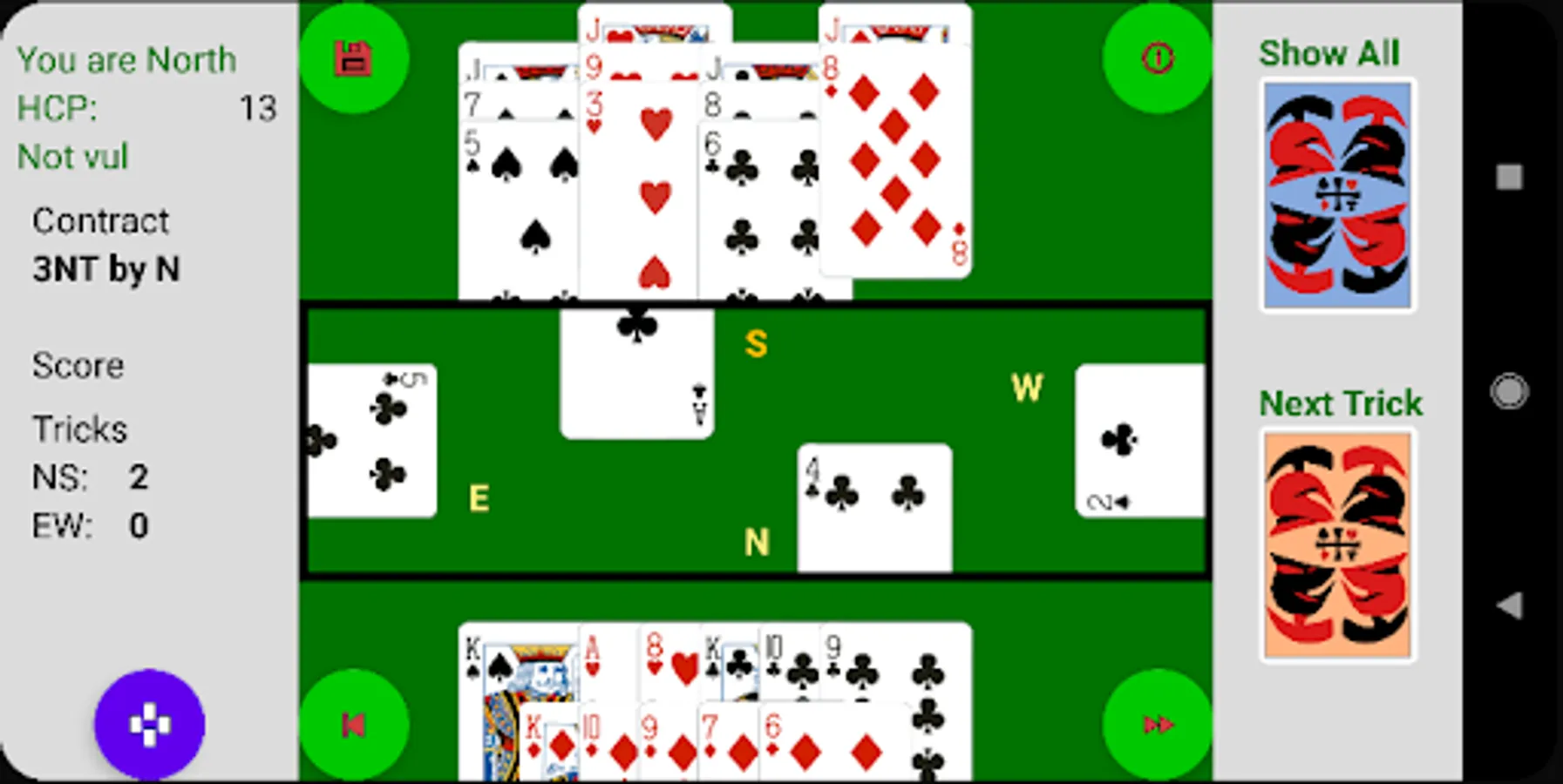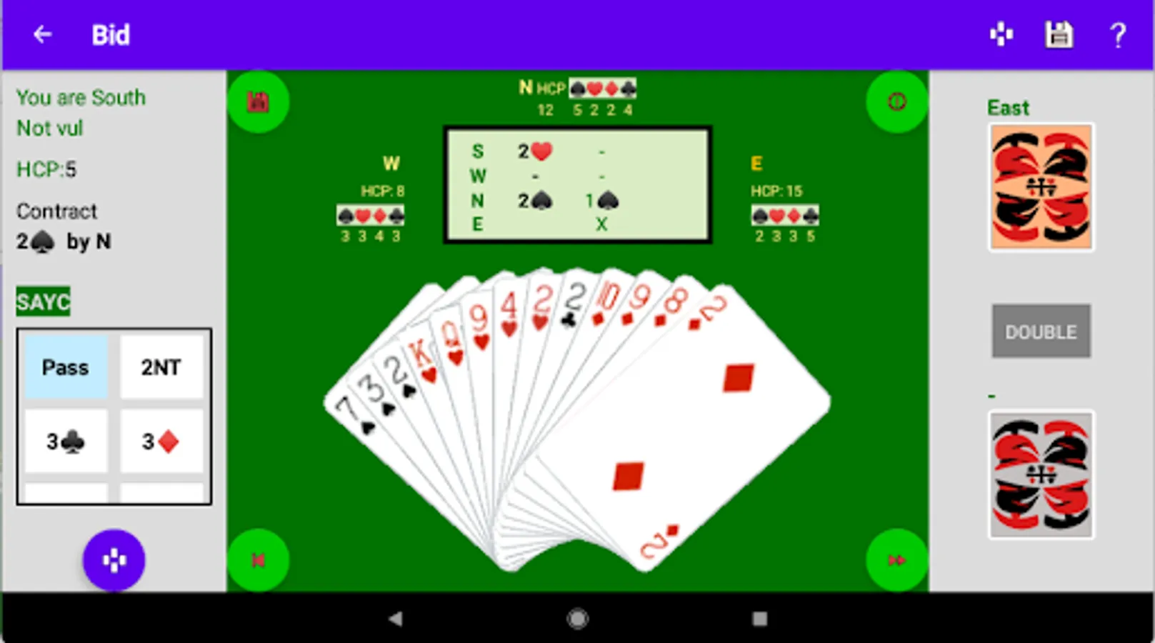 Learn and play Contract Bridge using Standard American, Acol or SEF (French) bidding. Play with rubber scoring or as a duplicate match.