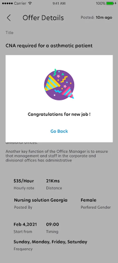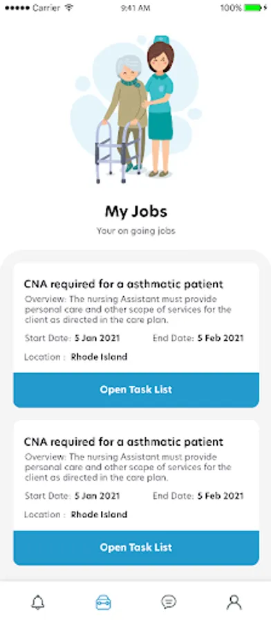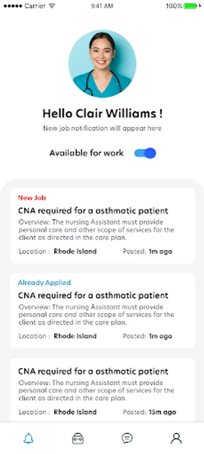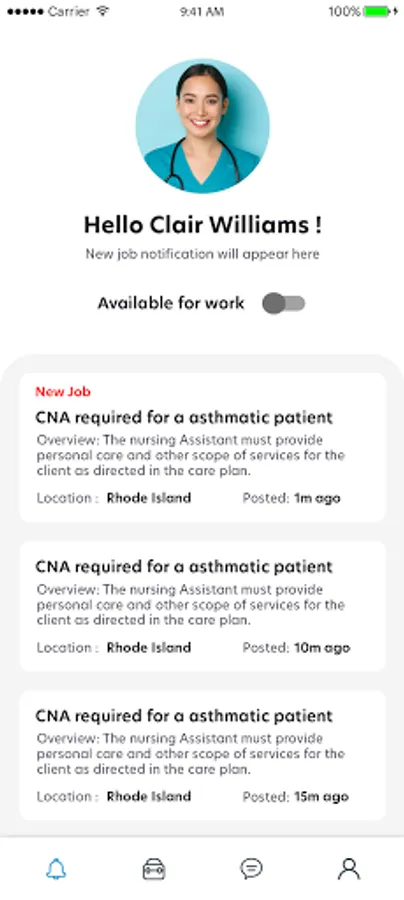 This is a Job search and Registration app for Nurses and Home care personnel. As a nurse, this app creates a notification system for you to get notified of jobs in your area as soon as they become available.
