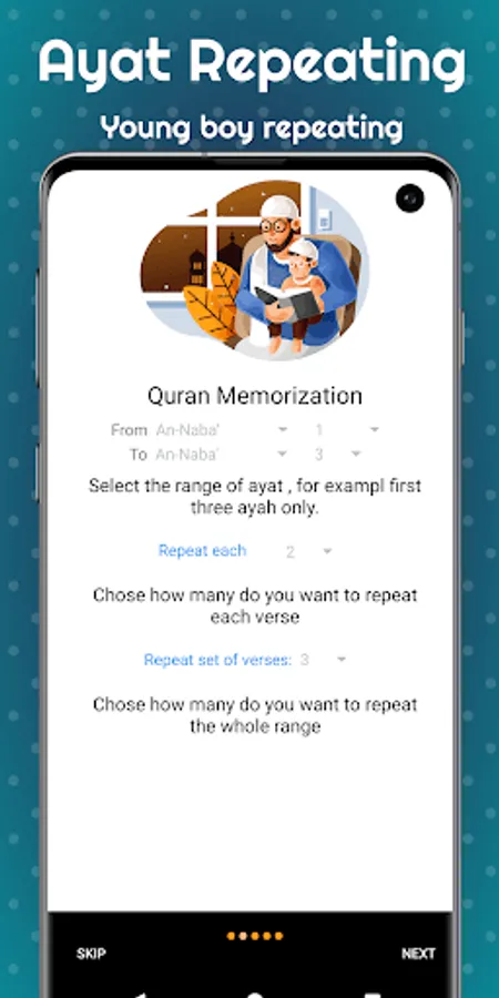 With this app you will be able to chose part of surat per ayah ( i.e 2 or 3 ayah) then you can control number of repeating both on the ayah level or on the whole range level.
