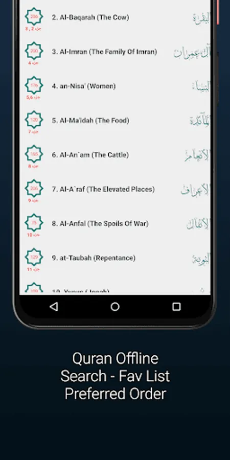 Also Surat names for this quran app in arabic, coran mp3 sans internet.