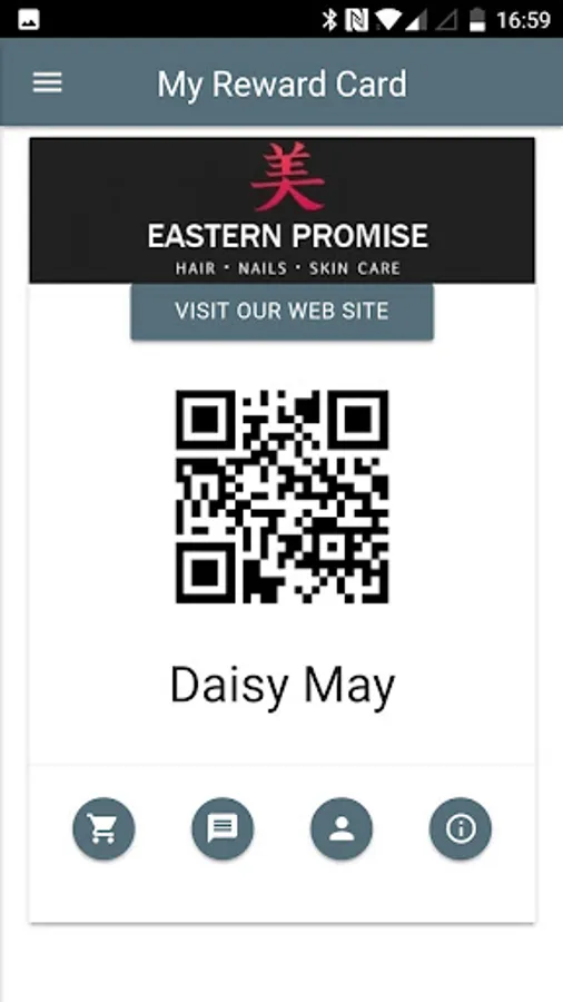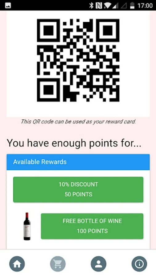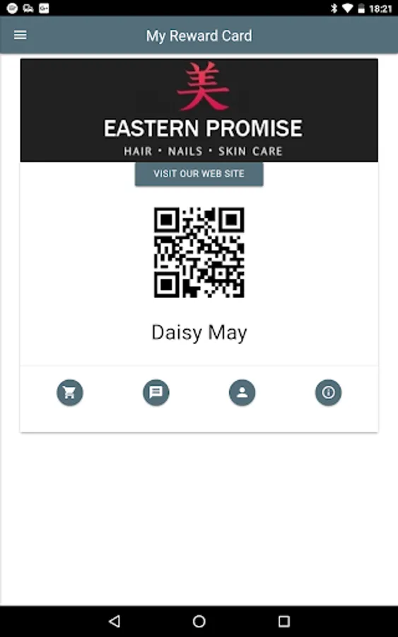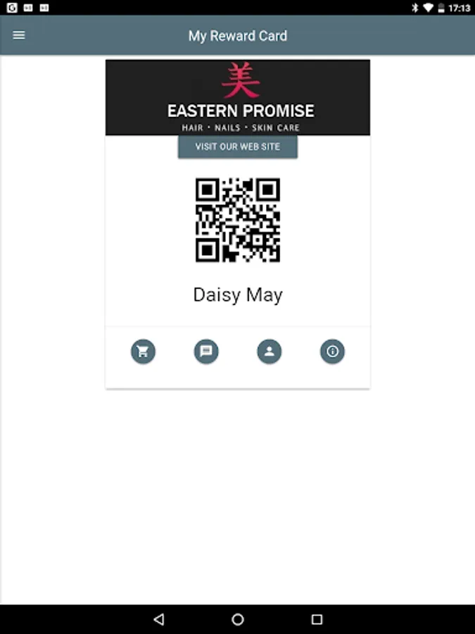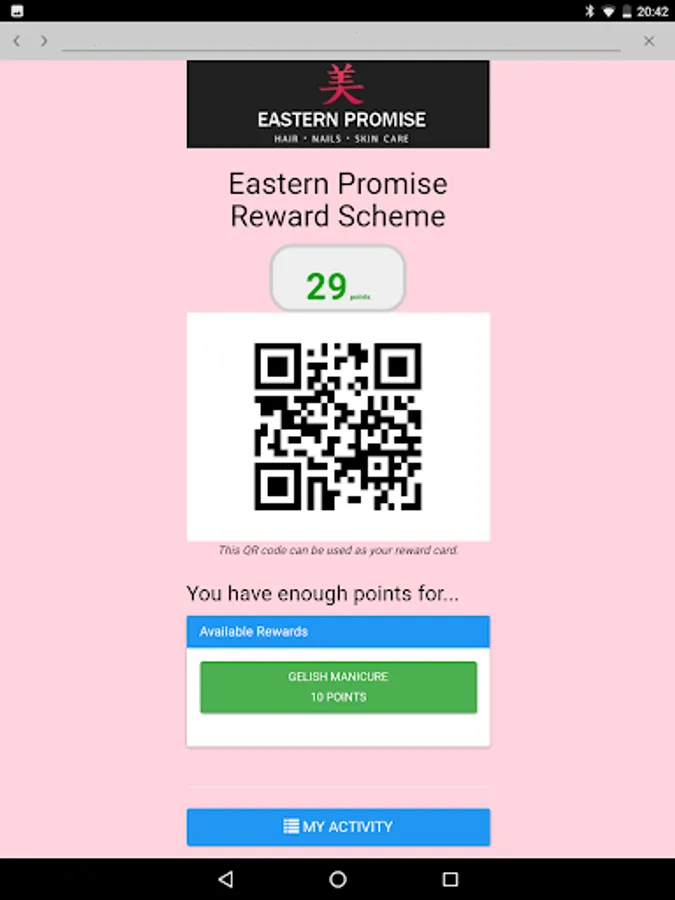 The app presents a reward card with a personal QR code for scanning by the business. The customer can also drill into their own account history and points balance presented in a web browser.