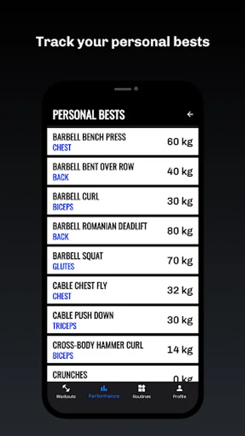 • Track your personal bests for exercises and muscle groups.