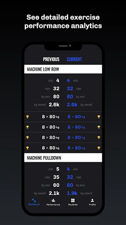• See overall performance analytics, muscle group analytics, and exercise analytics, including: