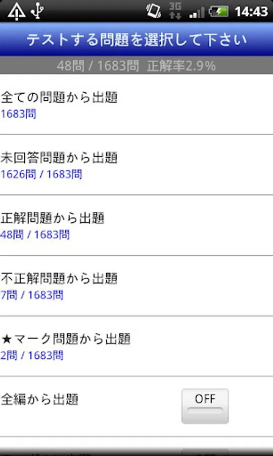 「問題を解く」メニューには「全ての問題から出題」「未回答問題から出題」「正解問題から出題」「不正解問題から出題」「★マーク問題から出題」の5種類があります。また,学習スタイルにあわせて「全編から出題」「ランダムに出題」を選択することができます。まずは「全ての問題から出題」からスタートしましょう。