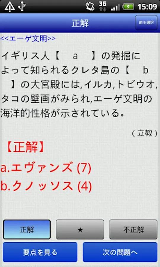 問題画面には「正解」「不正解」「★」のボタンがあります。知識が曖昧な問題には「★」ボタンを押しておくことで,トップメニュー「★マーク問題をチェック」より要点を参照しながら効率よく学習を進める事ができます。