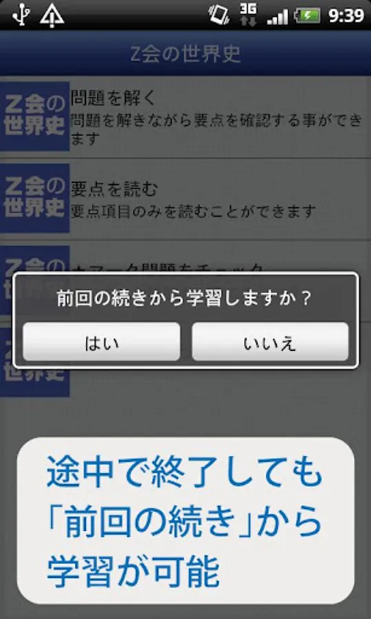 「Z会の世界史」は難関大学受験で定評のあるZ会の「入試に出る世界史B用語&問題2000」を元に,大人から受験生まで幅広い方に楽しみながら学習していただけるよう作成されたアプリケーションです。世界史用語問題を1683問収録。さらに理解が深まる詳細な要点・年表・地図等を収録。正解率表示機能も搭載しました。また,大学受験にも役立つよう,それぞれの問題には出題大学名と出題頻度を明記しました。