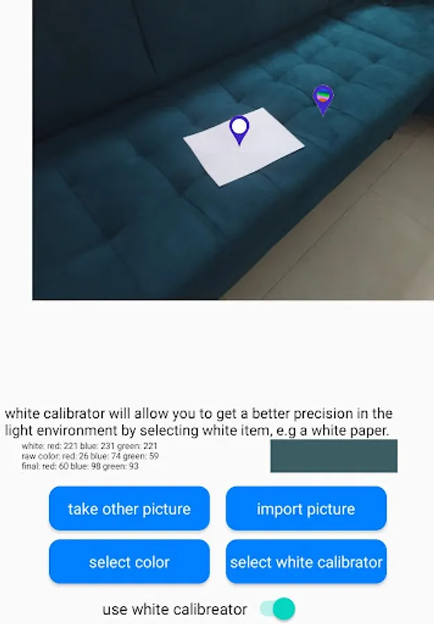 This app will allow you to match different colors with calibration, just select white color like a white paper and select the color that you want to grab and then you can compere it to other color or save the selected color.