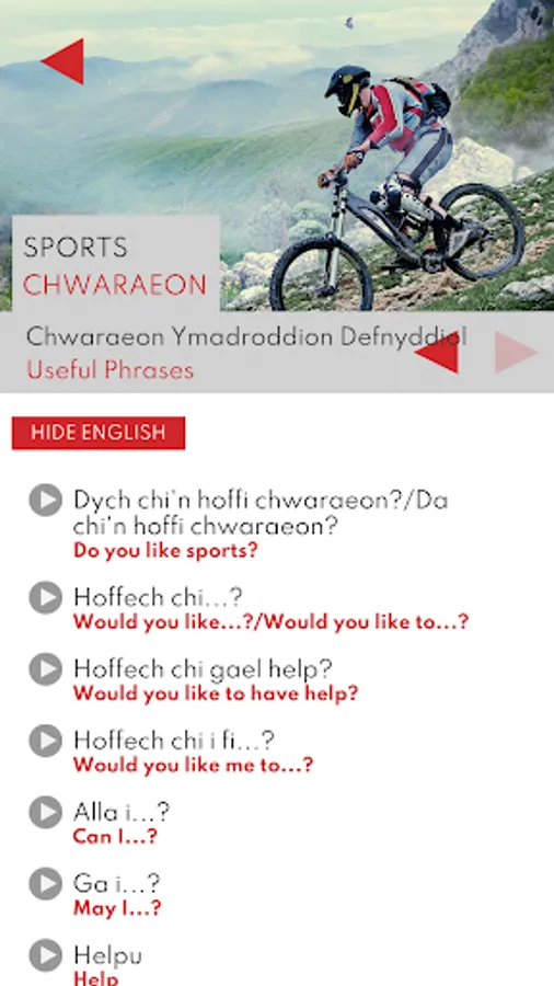 The aim of this app is to support learners, apprentices and employees who need support to be able to use the Welsh language confidently in professional situations related to Sport. The app has been funded by the Coleg Cymraeg Cenedlaethol with the Welsh Government support. It was developed by Coleg Cambria in partnership with Galactig, a bilingual digital creative agency. Voiced by Nicky John.