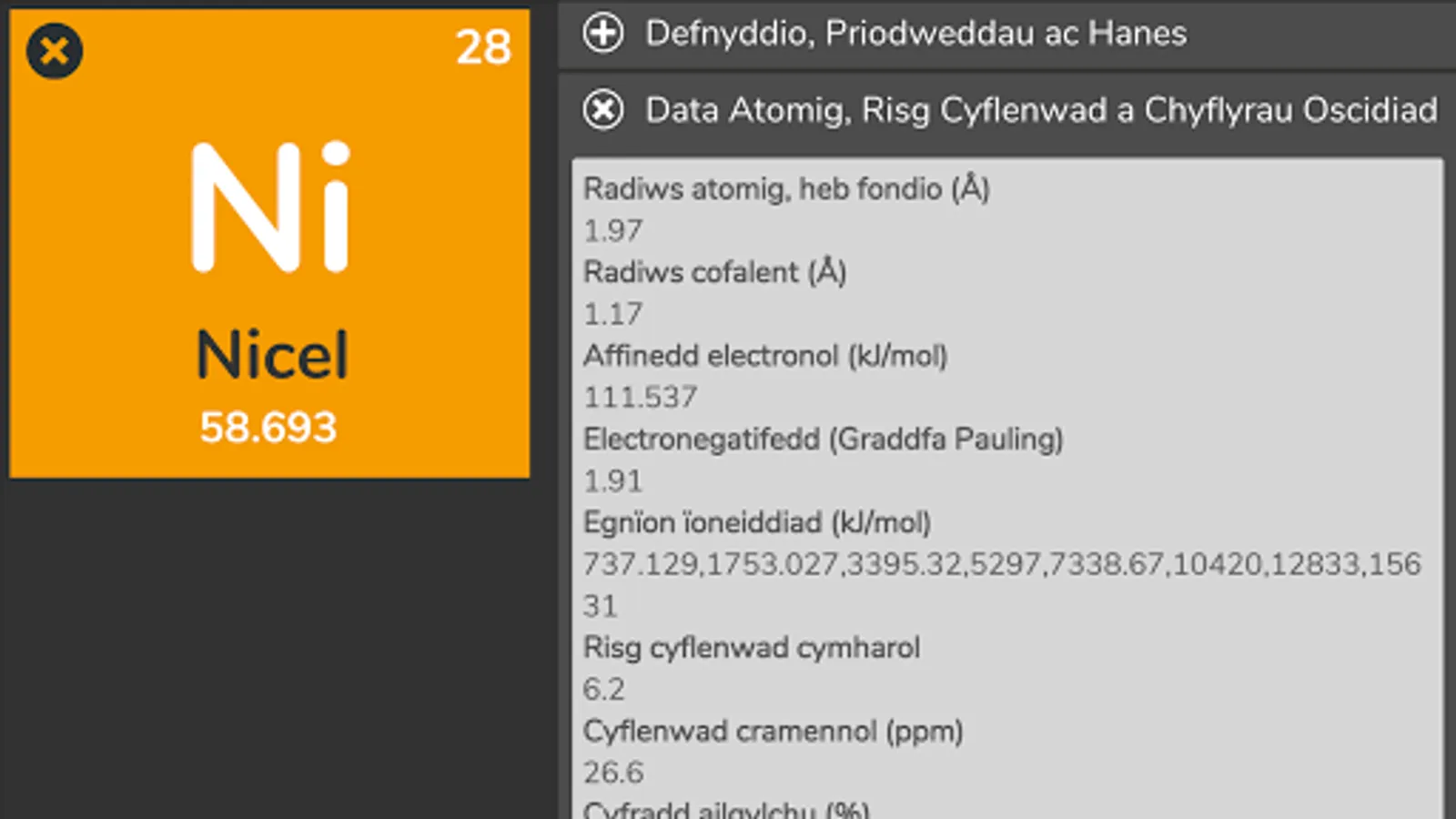 This fact-filled, image-rich, Welsh-medium periodic table app is ideal whether you're a student, teacher, or just have an interest in chemistry.