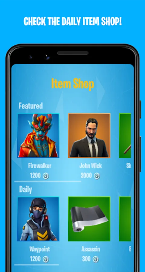 You can check the daily item shop from your mobile, without having to log in with your Epic Games' account. Check both the featured and daily items, their rarity and the price. Just with one touch!