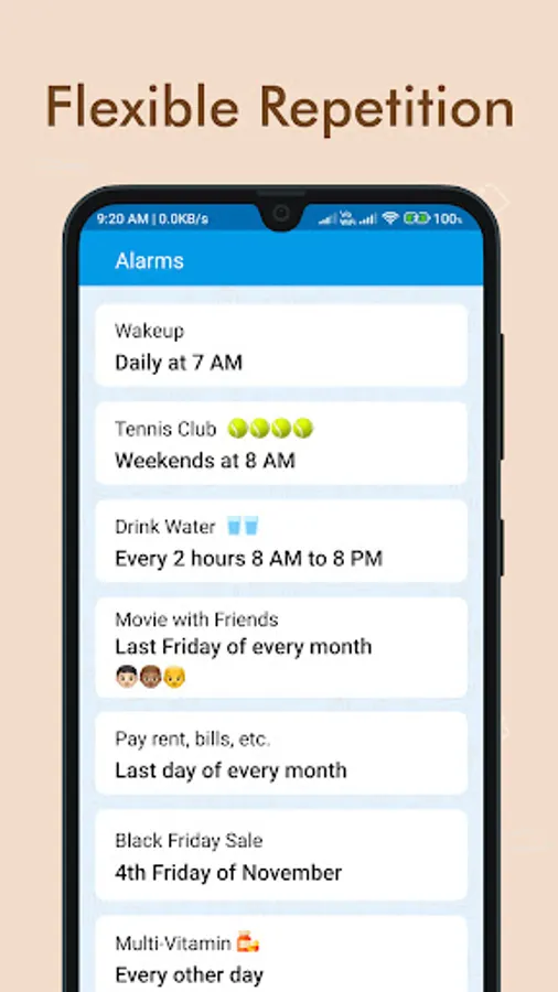 • FLEXIBLE REPETITION: Set alarms to repeat hourly, daily, weekly, monthly, or yearly to efficiently manage your to do list. Create reminders for taking your medicine 3 times a day, your yoga class every day, paying your rent on the 1st of every month and other such repeating activities.