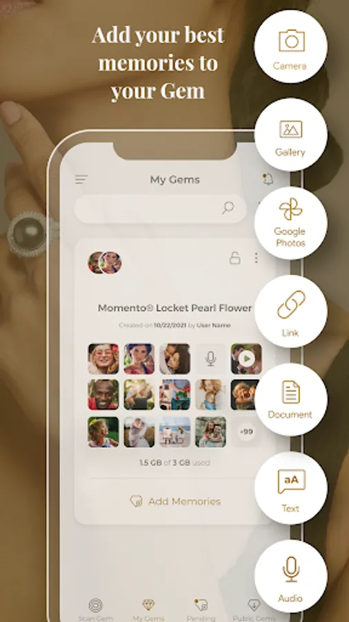 Declare your love, create memories and give a voice to your jewelry with the Momento app. Designed to be used in conjunction with the Momento Pearl™ Collection, this app utilizes NFC technology and your android device to turn jewelry into a true keepsake. Save your voice, text messages, images and videos on a precious pearl, in jewelry that you will cherish until the end of time.