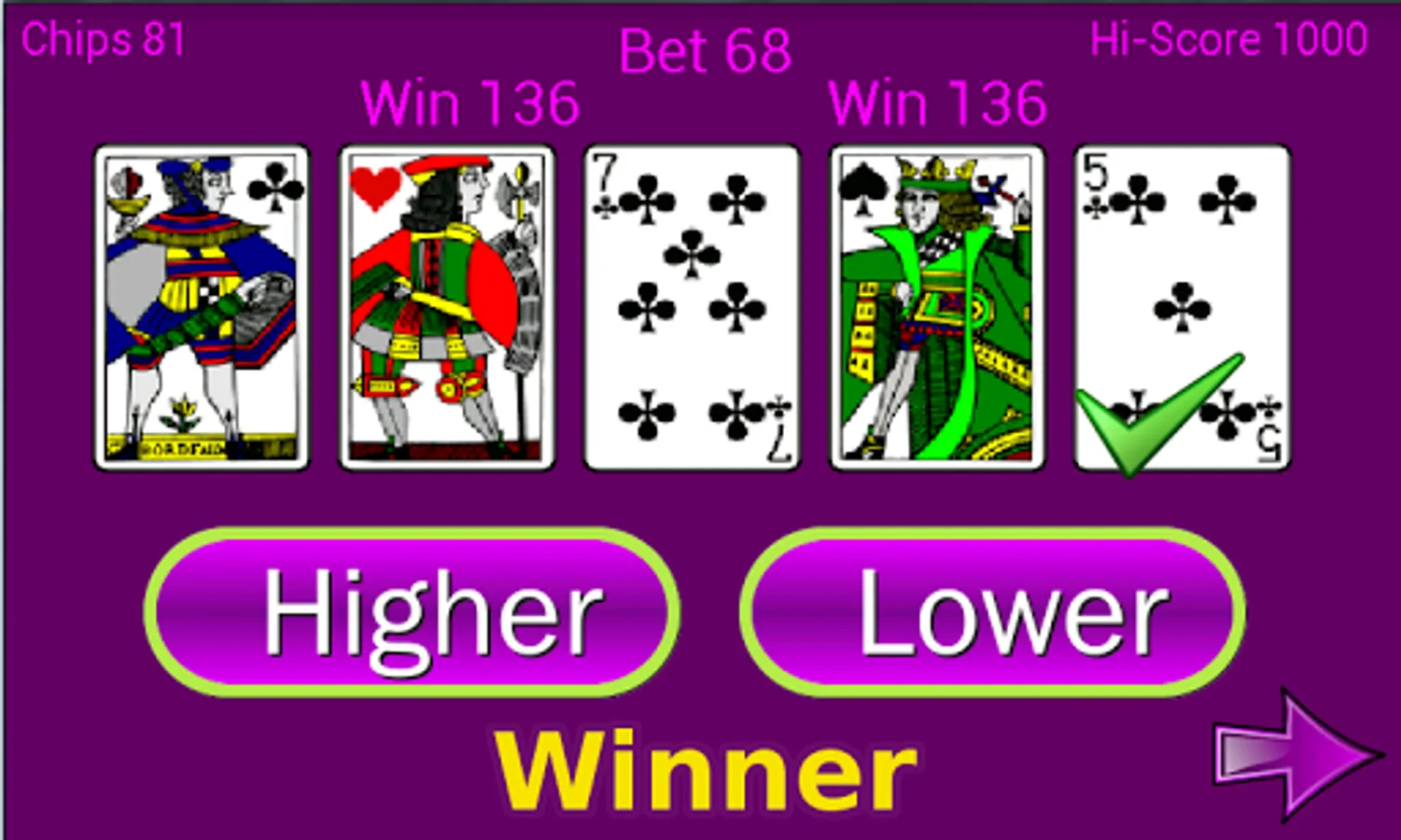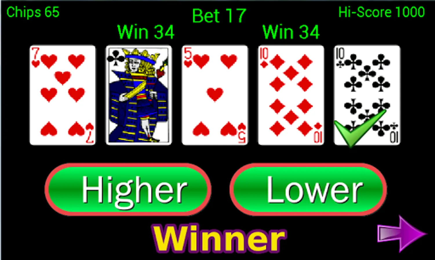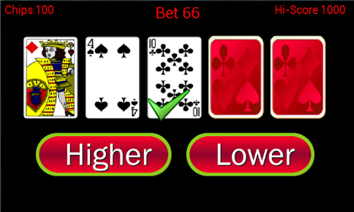 In our version we start with 5 cards and 500 chips, your task is to try and win as much as possible. You simply need to guess if the next card is higher or lower then the previous one, now you know where we got the name from ;-)