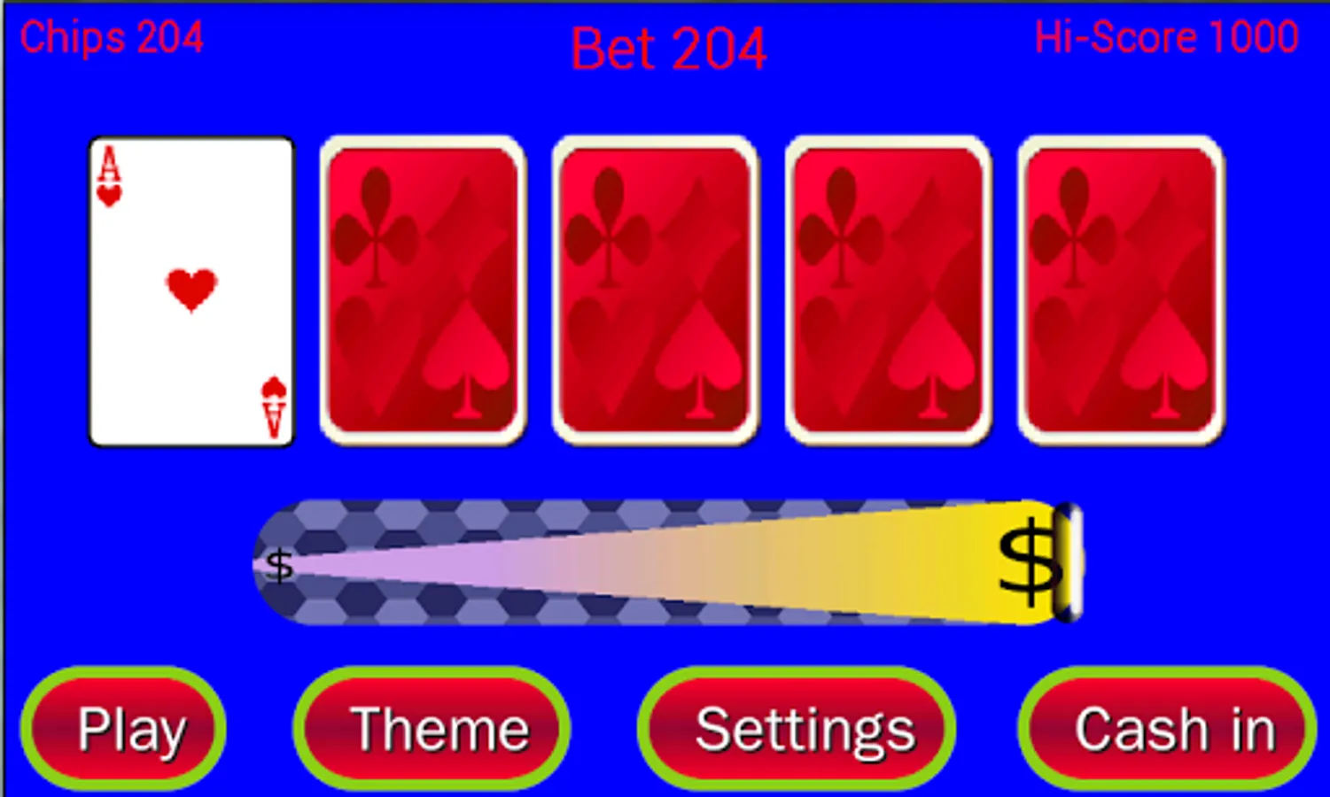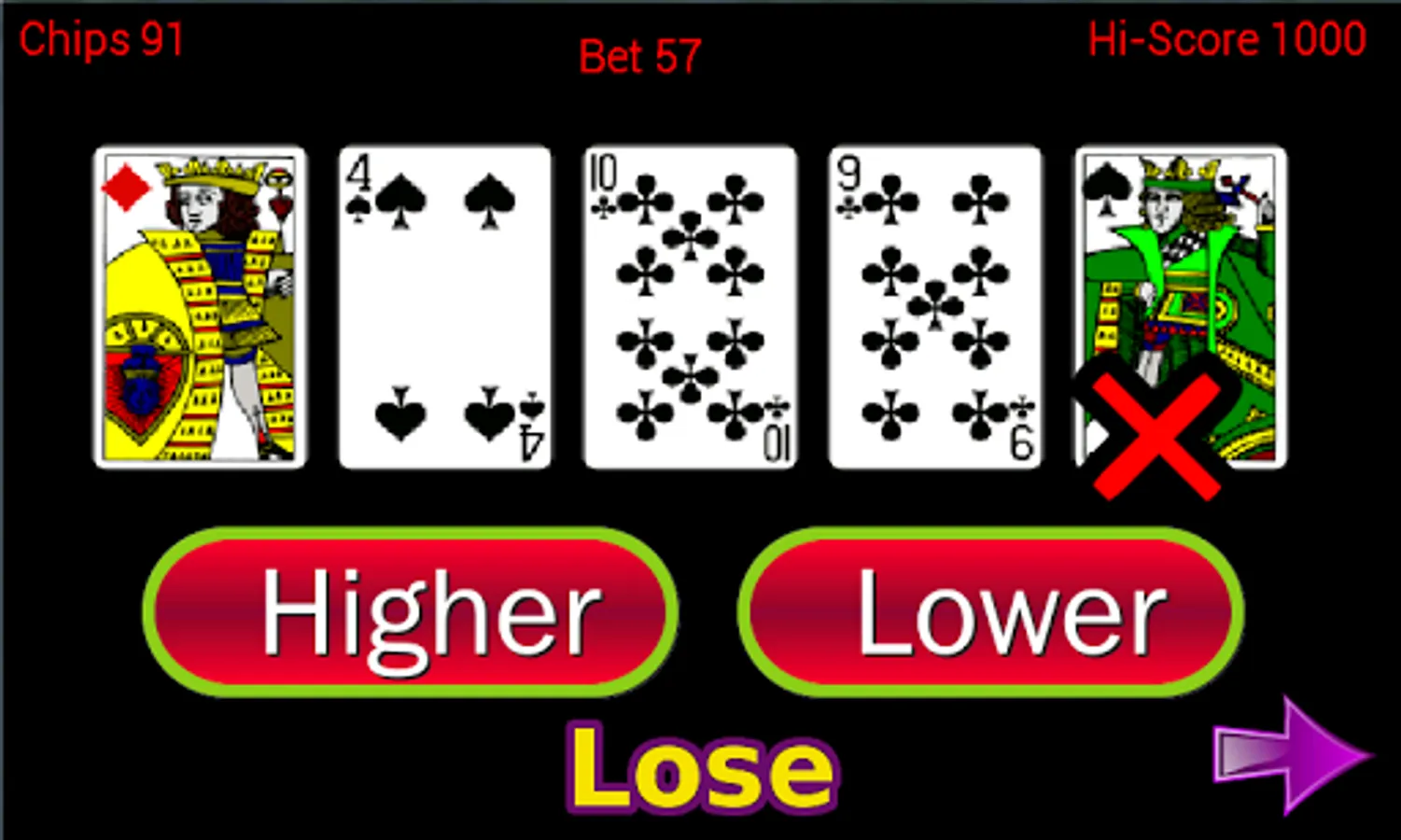 If you guess all cards right then you win. You can play as many rounds as you like building up your fortune. However you will only get a high score when you cash in and walk away with your winnings.
