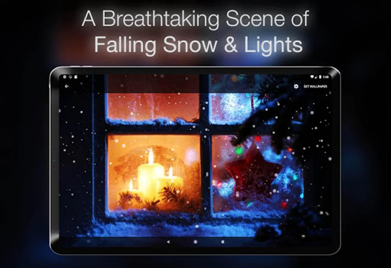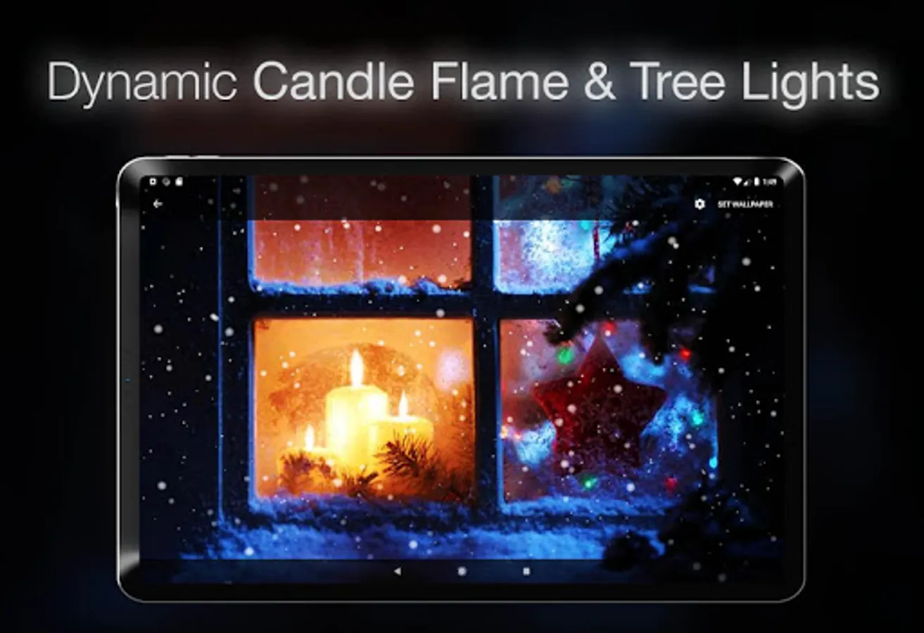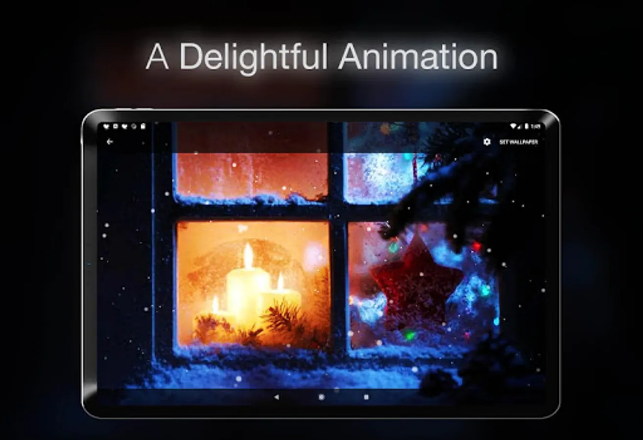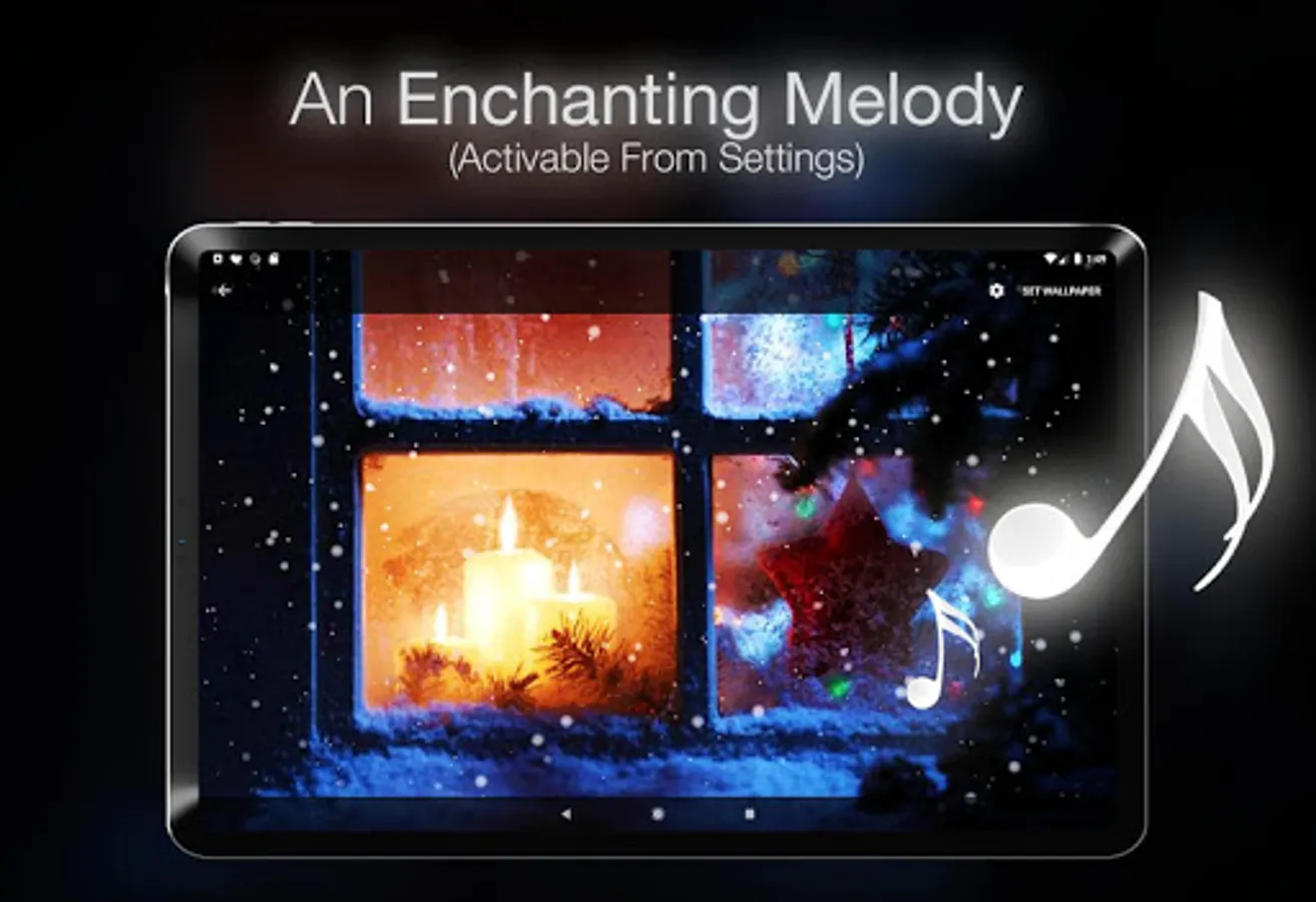 The most delightful live wallpaper for the Christmas holidays and New Year’s Eve party. Christmas Live Wallpaper design will let you embrace the festivity spirit form the first moment you see it. The scene portrays a beautiful wooden window, partly covered by the winter snow, while on the inside there are some gently burning candles and a Christmas tree decorated with fairy lights that pulsate like true Christmas lights. The panorama is decorated also by a gently falling snow that puts you on a nostalgic Christmas mood. The snowy Christmas scene would not be complete without a set of three traditional sweet Christmas music that you can put on background by choosing them from the settings menu. By viewing altogether, a mixture of magical awe and almost nostalgic feelings will permeate your mind. The snowfall, the fairy lights on the Christmas tree, the gently burning candle and the sweet music will make you never forget these moments.