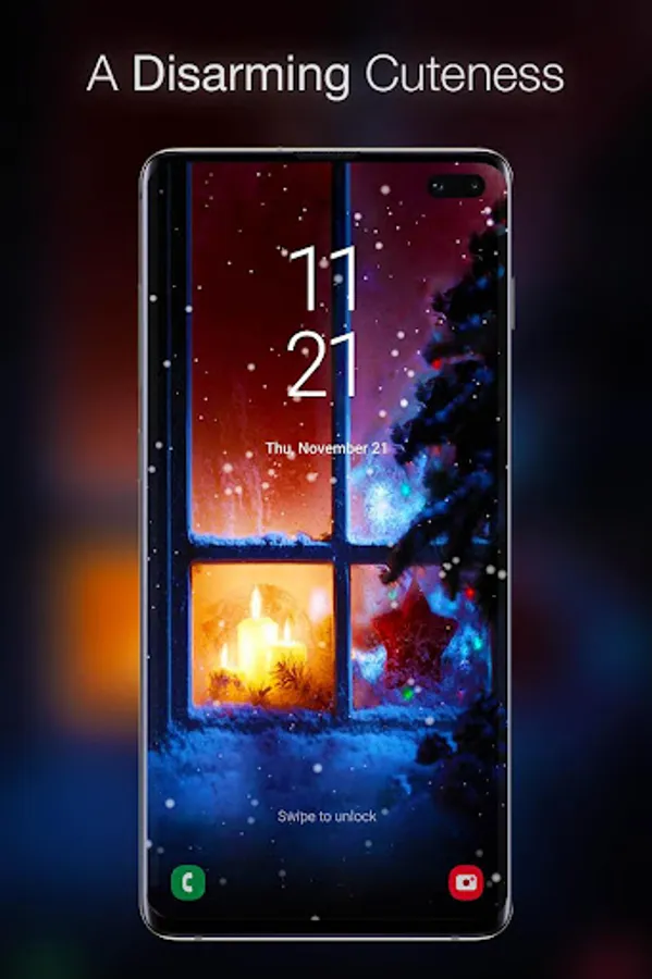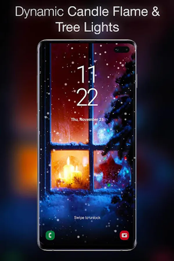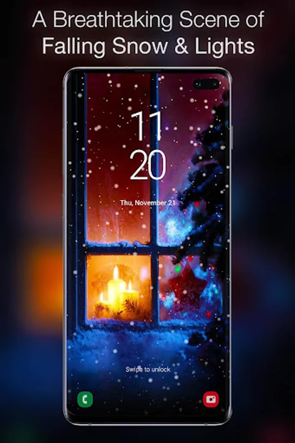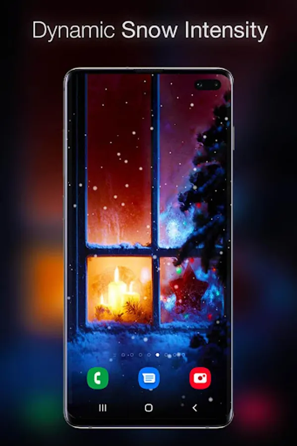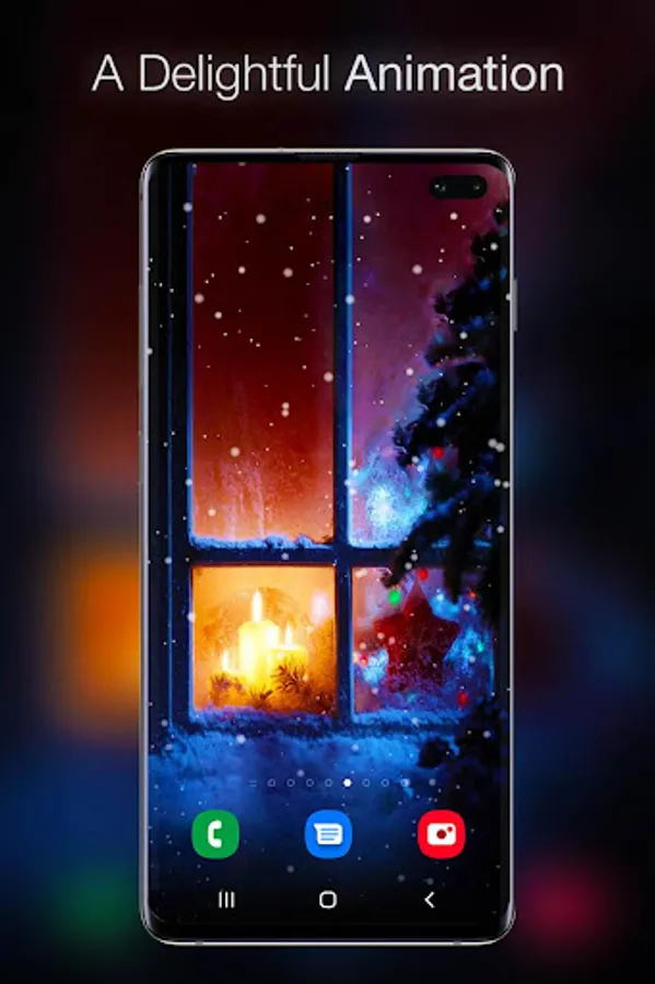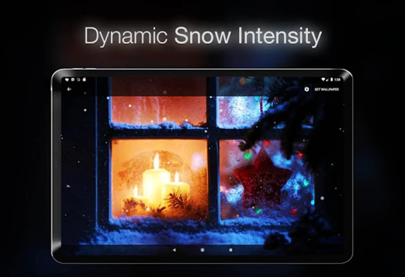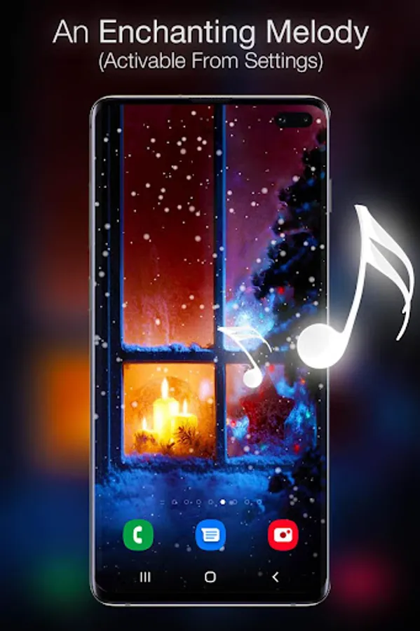 The most delightful live wallpaper for the Christmas holidays and New Year’s Eve party. Christmas Live Wallpaper design will let you embrace the festivity spirit form the first moment you see it. The scene portrays a beautiful wooden window, partly covered by the winter snow, while on the inside there are some gently burning candles and a Christmas tree decorated with fairy lights that pulsate like true Christmas lights. The panorama is decorated also by a gently falling snow that puts you on a nostalgic Christmas mood. The snowy Christmas scene would not be complete without a set of three traditional sweet Christmas music that you can put on background by choosing them from the settings menu. By viewing altogether, a mixture of magical awe and almost nostalgic feelings will permeate your mind. The snowfall, the fairy lights on the Christmas tree, the gently burning candle and the sweet music will make you never forget these moments.